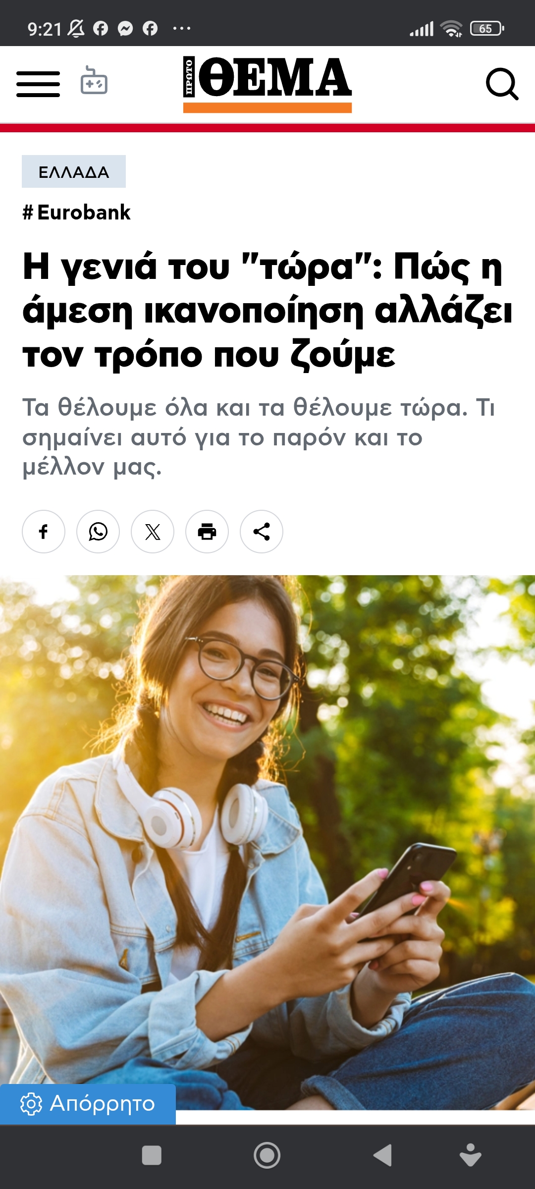 Σχέσεις - Υγεία…στην εποχή και τη γενιά του “τώρα” Πέτρος Ιωάννου8 μήνες ago8 μήνες ago01 mins 13/8/2025 https://www.protothema.gr/greece/article/1679541/i-genia-tou-tora-pos-i-amesi-ikanopoiisi-allazei-ton-tropo-pou-zoume/?utm_source=native&utm_medium=standard&utm_campaign=eurobank&utm_id=any Πλοήγηση άρθρων Previous: Πολλοί νιώθουμε πως τρώμε διεθνώς καρπαζιές. Ο Παντελής Καψής διαφωνείNext: Κοβέσι: Τα εκατομμύρια €, που έφτασαν Ελλάδα, θα μπορούσαν ν’ αποσοβήσουν την τραγωδία Αφήστε μια απάντηση Ακύρωση απάντησηςΗ ηλ. διεύθυνση σας δεν δημοσιεύεται. Τα υποχρεωτικά πεδία σημειώνονται με *Σχόλιο * Όνομα * Email * Ιστότοπος Αποθήκευσε το όνομά μου, email, και τον ιστότοπο μου σε αυτόν τον πλοηγό για την επόμενη φορά που θα σχολιάσω.