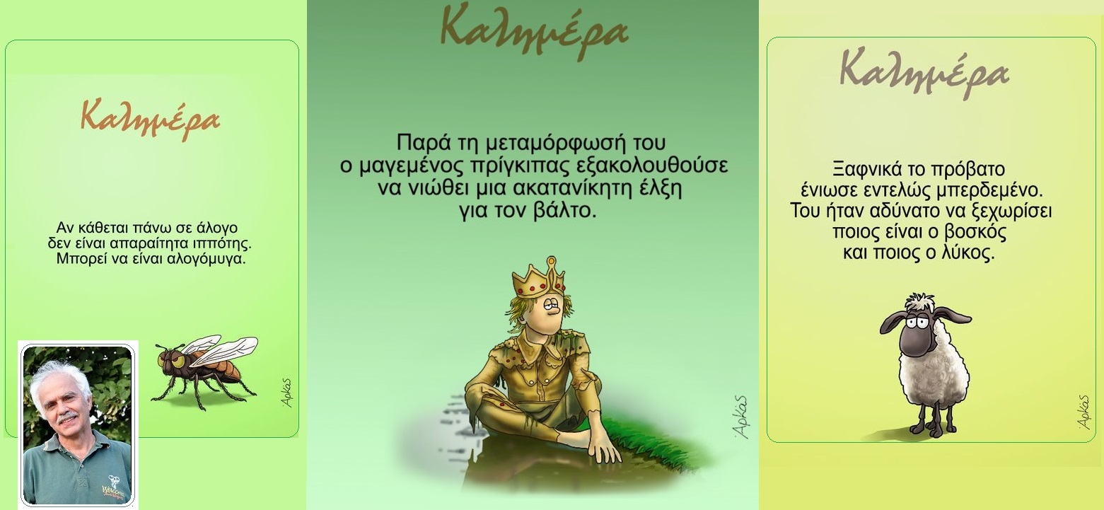 -Αγαπάμε καθ’ υπερβολήν τ΄άλογα, τα καμαρώνουμε για την κορμοστασιά τους, όμως άλογα ζώα γεν πρέπει να γίνουμε ποτέ… Καμαρώνουμε τους καβαλάρηδες και μισούμε τις μύγες, όπου κι αν ξεπροβάλλουν. Πουθενά δεν είναι ανεκτές.