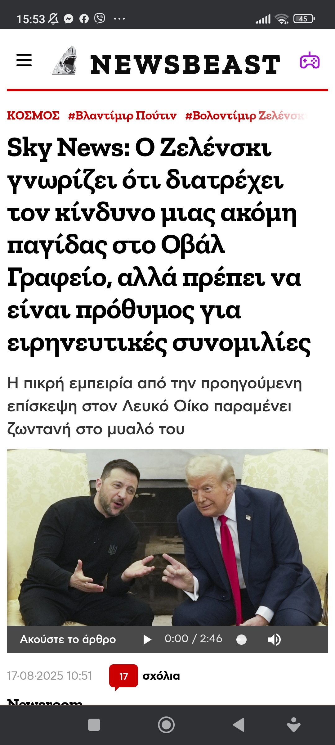 Eυρώπη / ΔιεθνήΠρόθυμος ο Ζελένσκι χωρίς να ξεχνά το κάζο του χειμώνα Πέτρος Ιωάννου8 μήνες ago8 μήνες ago01 mins 18/8/2025 https://www.newsbeast.gr/world/arthro/12514928/sky-news-o-zelenski-gnorizei-oti-diatrechei-ton-kindyno-mias-akomi-pagidas-sto-oval-grafeio-alla-prepei-na-einai-prothymos-gia-eirineftikes-synomilies Πλοήγηση άρθρων Previous: Franz Jägerstätter ίσως ο μοναδικός που αρνήθηκε να υπηρετήσει τους ναζί κι εκτελέστηκεNext: προφήτης: κάλιο ν’ αλλάξετε οι ίδιοι, παρά τις κυβερνήσεις Αφήστε μια απάντηση Ακύρωση απάντησηςΗ ηλ. διεύθυνση σας δεν δημοσιεύεται. Τα υποχρεωτικά πεδία σημειώνονται με *Σχόλιο * Όνομα * Email * Ιστότοπος Αποθήκευσε το όνομά μου, email, και τον ιστότοπο μου σε αυτόν τον πλοηγό για την επόμενη φορά που θα σχολιάσω.
