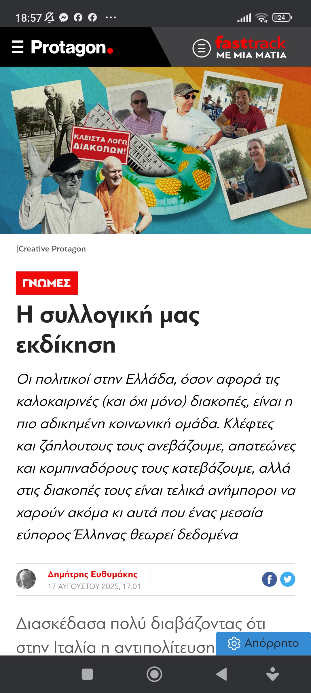 Κοινωνία / Πολιτική«Όρσε, πρωθυπουργός της Ελλάδας να σου πετύχει» Πέτρος Ιωάννου8 μήνες ago8 μήνες ago01 mins 18/8/2025 Η συλλογική μας εκδίκηση Πλοήγηση άρθρων Previous: προφήτης: κάλιο ν’ αλλάξετε οι ίδιοι, παρά τις κυβερνήσειςNext: Φαύλος κύκλος… Αφήστε μια απάντηση Ακύρωση απάντησηςΗ ηλ. διεύθυνση σας δεν δημοσιεύεται. Τα υποχρεωτικά πεδία σημειώνονται με *Σχόλιο * Όνομα * Email * Ιστότοπος Αποθήκευσε το όνομά μου, email, και τον ιστότοπο μου σε αυτόν τον πλοηγό για την επόμενη φορά που θα σχολιάσω.