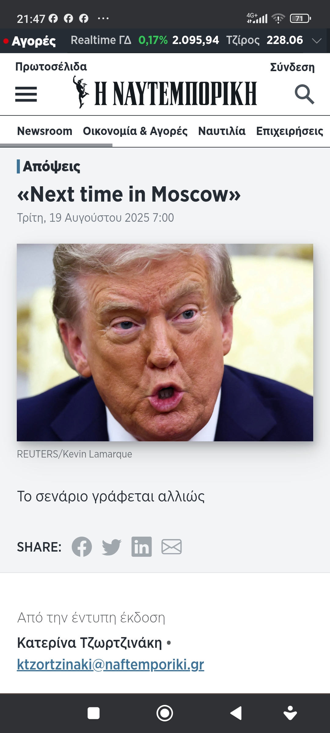 Το σενάριο γράφεται αλλιώς. Ο ένοικος του Κρεμλίνου, που επανέλαβε ότι το ουκρανικό είναι έθνος αδελφό, έκλεισε στα αγγλικά τη συνάντηση στο ημι-παγωμένο Άνκορεϊτζ με πρόταση στον Τραμπ: «Την επόμενη φορά στη Μόσχα». Ο Τραμπ απάντησε: «Θα υπάρξουν αντιδράσεις, αλλά ίσως να το δω να γίνεται».Τι δεν γίνεται; Ειδικά στην ήπειρο των δύο Παγκοσμίων Πολέμων, οι πόλεμοι δεν τελειώνουν μέσα σε λίγες μέρες, όπως φαντασιωνόταν. Προφανώς, η Αλάσκα δεν είναι το τέλος, ούτε καν η αρχή του τέλους. Ήταν ιστορική, όπως είχε προαναγγελθεί; Κάθισαν οι πραγματικοί εμπόλεμοι, οι δύο μεγαλύτερες πυρηνικές δυνάμεις, στο ίδιο τραπέζι. Η τελευταία φορά ήταν στις 16 Ιουνίου 2021 στη Γενεύη. «Δύο μεγάλες δυνάμεις», είπε τότε ο Μπάιντεν, αγγίζοντας ευαίσθητη χορδή. Αυτό ήθελε ο Πούτιν για αρχή, να γίνεται η Ρωσία ως υπερδύναμη αποδεκτή.