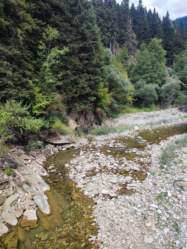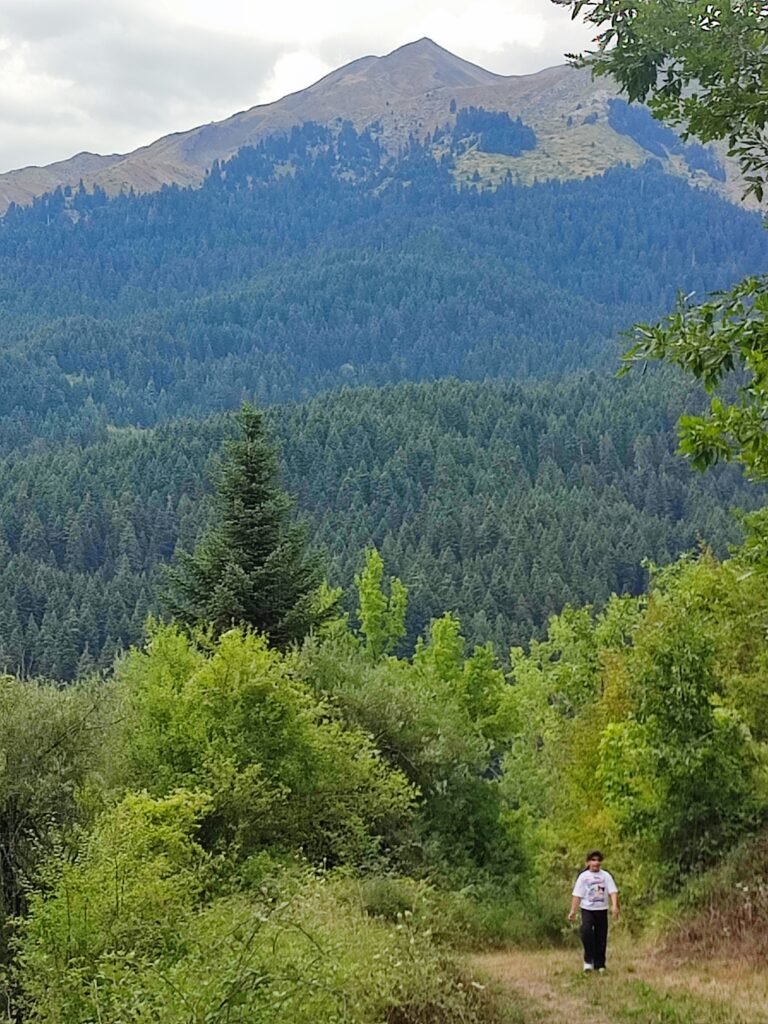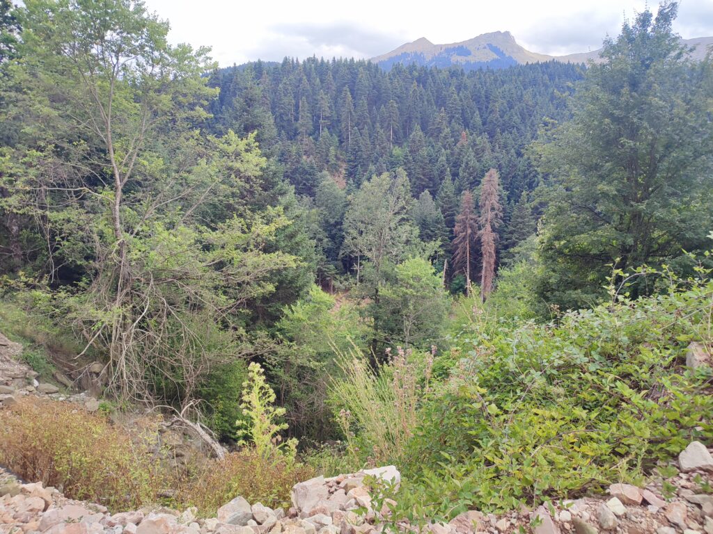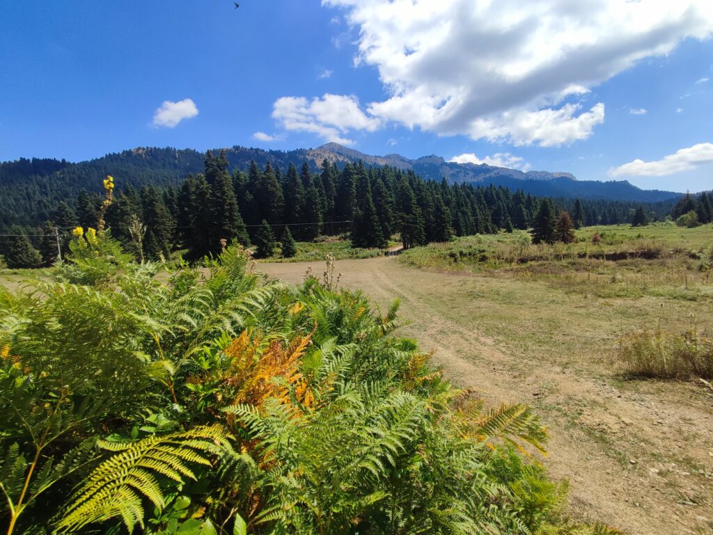 Νεραϊδοχώρι. Τοπίο πνιγμένο στο πράσινο. Τα έλατα κυριαρχούν . Στο βάθος η Μαρόσα, αριστερά και δεξιά Κόζιακας και Νεράιδα.