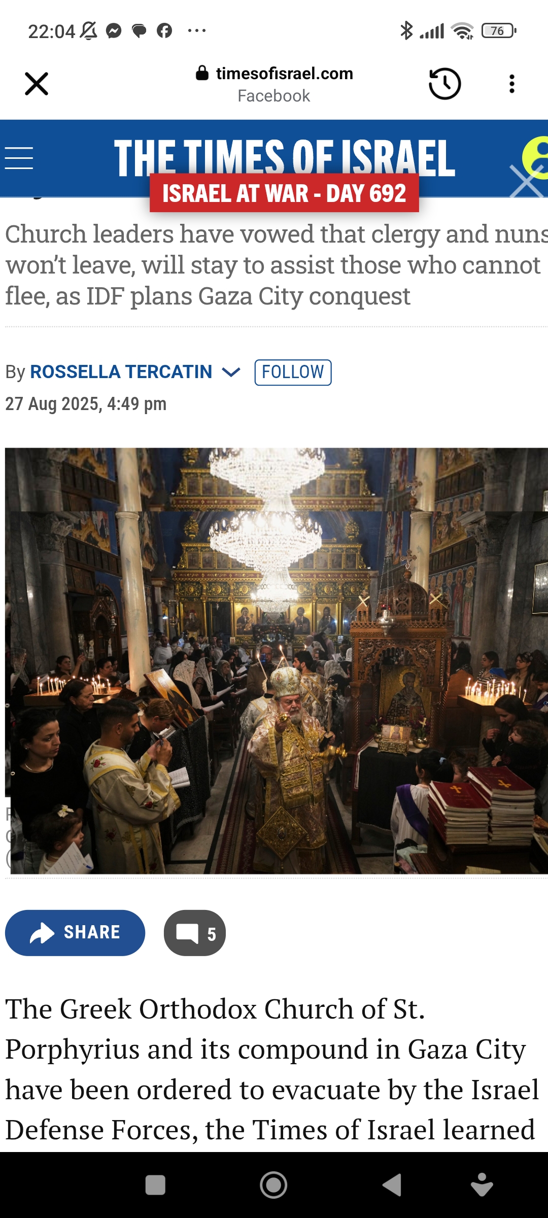 - Ο ισραηλινός στρατός διέταξε την εκκένωση της Ορθόδοξης Εκκλησίας του Αγίου Πορφυρίου στην πόλη της Γάζας. Οι ηγούμενος της εκκλησίας απάντησε ότι οι μοναχοί και οι μοναχές δεν θα φύγουν, θα παραμείνουν για να βοηθήσουν όσους δεν μπορούν να μετακινηθούν, καθώς οι Ισραηλινές Δυνάμεις σχεδιάζουν την κατάληψη της πόλης της Γάζας, σύμφωνα με δημοσίευμα των Times of Israel.