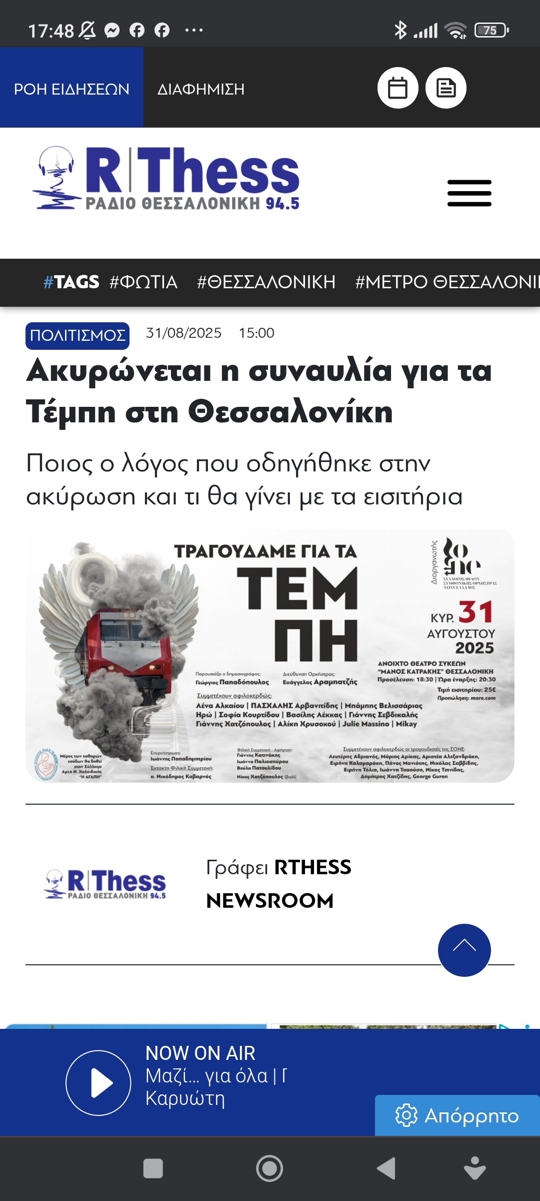 Έγκλημα και τιμωρία Εκπαίδευση / ΠολιτισμόςΑκυρώθηκε η συναυλία για τα Τέμπη Πέτρος Ιωάννου8 μήνες ago8 μήνες ago01 mins 31/8/2025 Ακυρώνεται η συναυλία για τα Τέμπη στη Θεσσαλονίκη Πλοήγηση άρθρων Previous: Σκίτσο του Κώστα Γρηγοριάδη για την Εφημερίδα των ΣυντακτώνNext: Οι αποχρώσεις στο άγαλμα της Ελευθερίας Αφήστε μια απάντηση Ακύρωση απάντησηςΗ ηλ. διεύθυνση σας δεν δημοσιεύεται. Τα υποχρεωτικά πεδία σημειώνονται με *Σχόλιο * Όνομα * Email * Ιστότοπος Αποθήκευσε το όνομά μου, email, και τον ιστότοπο μου σε αυτόν τον πλοηγό για την επόμενη φορά που θα σχολιάσω.