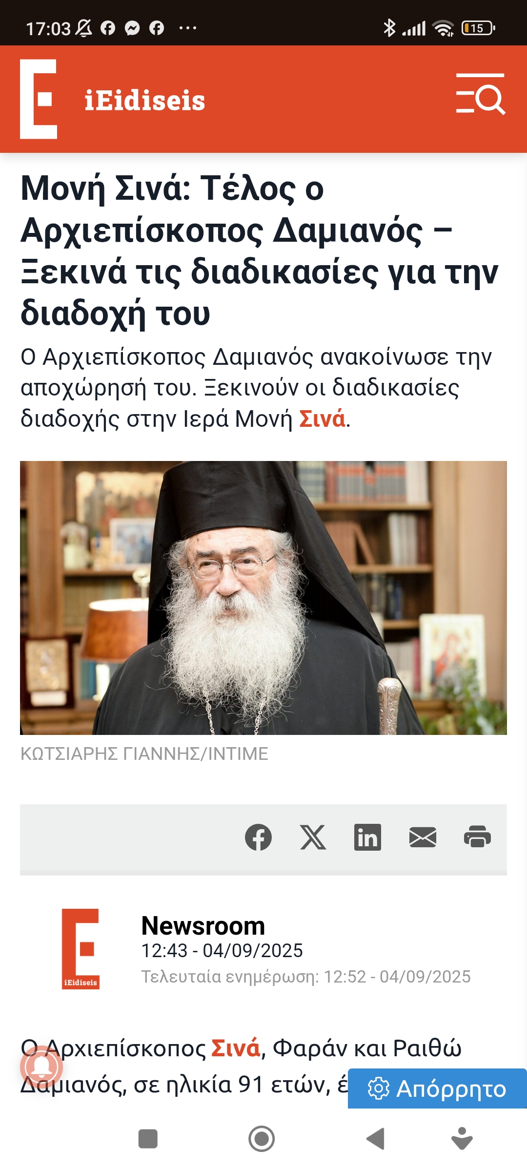 "Πίστη το ένα το σκαλί..."Υπό το βάρος των πιέσεων, παραιτήθηκε ο Σινά Δαμιανός Πέτρος Ιωάννου7 μήνες ago7 μήνες ago01 mins 4/9/2025 https://www.ieidiseis.gr/ellada/572452/moni-sina-telos-o-archiepiskopos-damianos-xekina-tis-diadikasies-gia-tin-diadochi-toy Πλοήγηση άρθρων Previous: Το δημογραφικό και η αστυφιλία καίνε όσο ποτέNext: Οριστική παύση στους αντιδρώντες ν’ αξιολογηθούν Αφήστε μια απάντηση Ακύρωση απάντησηςΗ ηλ. διεύθυνση σας δεν δημοσιεύεται. Τα υποχρεωτικά πεδία σημειώνονται με *Σχόλιο * Όνομα * Email * Ιστότοπος Αποθήκευσε το όνομά μου, email, και τον ιστότοπο μου σε αυτόν τον πλοηγό για την επόμενη φορά που θα σχολιάσω.