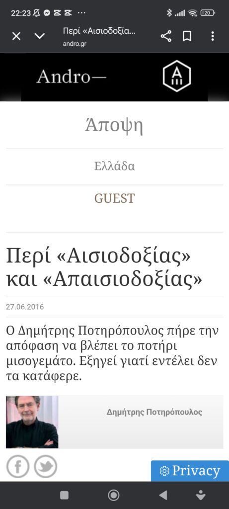 ...ξανά στα θρανία, στη μεγάλη των γελοιογράφων σχολή ΑπόψειςΠερί “αισιοδοξίας” και “απαισιοδοξίας” Πέτρος Ιωάννου7 μήνες ago7 μήνες ago01 mins Περί «Αισιοδοξίας» και «Απαισιοδοξίας» Πλοήγηση άρθρων Previous: Αιχμή του Αρκά στον καιρό της “αριστερής παρένθεσης”Next: Ιδιαίτερα μαθήματα Αφήστε μια απάντηση Ακύρωση απάντησηςΗ ηλ. διεύθυνση σας δεν δημοσιεύεται. Τα υποχρεωτικά πεδία σημειώνονται με *Σχόλιο * Όνομα * Email * Ιστότοπος Αποθήκευσε το όνομά μου, email, και τον ιστότοπο μου σε αυτόν τον πλοηγό για την επόμενη φορά που θα σχολιάσω.