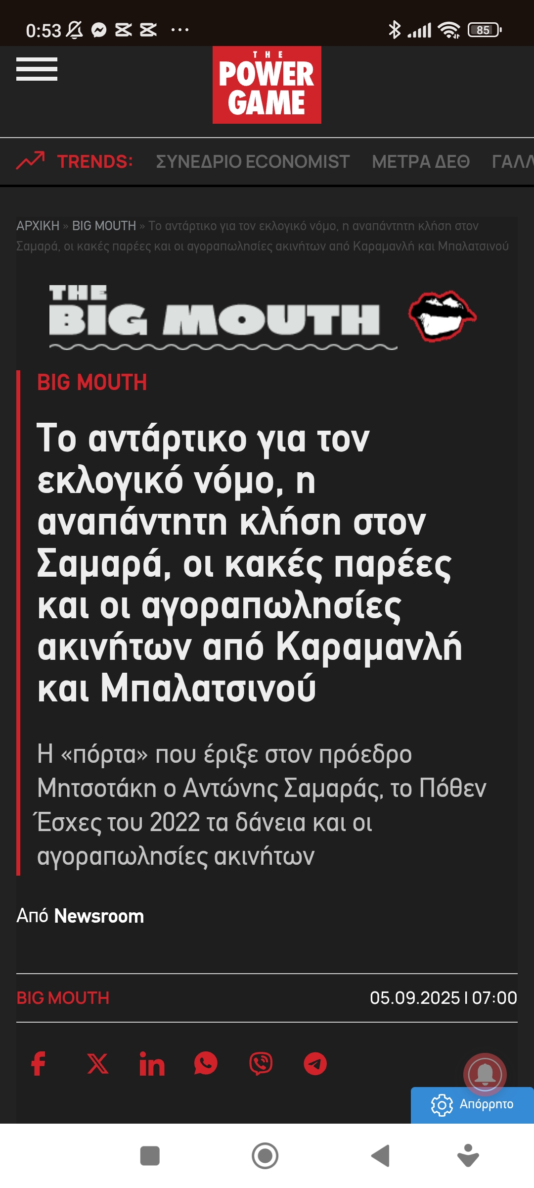 Κοινωνία / ΠολιτικήΤα νέα της πολιτικής σκηνής από πρώτο χέρι Πέτρος Ιωάννου7 μήνες ago7 μήνες ago01 mins 6/9/2025 https://www.powergame.gr/big-mouth/1082358/to-antartiko-gia-ton-eklogiko-nomo-i-anapantiti-klisi-ston-samara-oi-kakes-parees-kai-oi-agorapolisies-akiniton-apo-karamanli-kai-balatsinou Πλοήγηση άρθρων Previous: Η έννοια του πατριωτισμούNext: Μαρία Καρυστιανού: Καταφέραμε όλοι και γίναμε ένα (Σύνταγμα, όλες οι ομιλίες) Αφήστε μια απάντηση Ακύρωση απάντησηςΗ ηλ. διεύθυνση σας δεν δημοσιεύεται. Τα υποχρεωτικά πεδία σημειώνονται με *Σχόλιο * Όνομα * Email * Ιστότοπος Αποθήκευσε το όνομά μου, email, και τον ιστότοπο μου σε αυτόν τον πλοηγό για την επόμενη φορά που θα σχολιάσω.