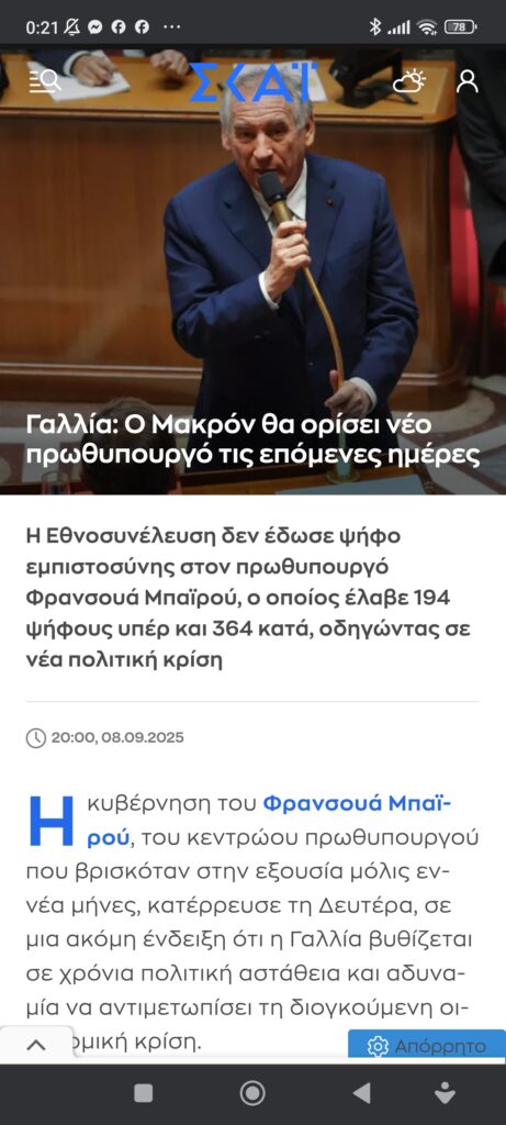 Eυρώπη / ΔιεθνήΈπεσε η κυβέρνηση Μπαϊρού Πέτρος Ιωάννου8 μήνες ago8 μήνες ago01 mins 8/9/2025 https://www.skai.gr/news/world/i-ethnosyneleysi-den-edose-psifos-empistosynis-ston-mpairou Πλοήγηση άρθρων Previous: Θάνος Παπαδόπουλος: Δεν ήταν μόνο επακούμβηση, ήταν η φωνή όλων των ανθρώπων της θάλασσας, που έλεγε «ως εδώ».Next: Χαρακτηριστικά που έχουν οι επαναστάτες Αφήστε μια απάντηση Ακύρωση απάντησηςΗ ηλ. διεύθυνση σας δεν δημοσιεύεται. Τα υποχρεωτικά πεδία σημειώνονται με *Σχόλιο * Όνομα * Email * Ιστότοπος Αποθήκευσε το όνομά μου, email, και τον ιστότοπο μου σε αυτόν τον πλοηγό για την επόμενη φορά που θα σχολιάσω.