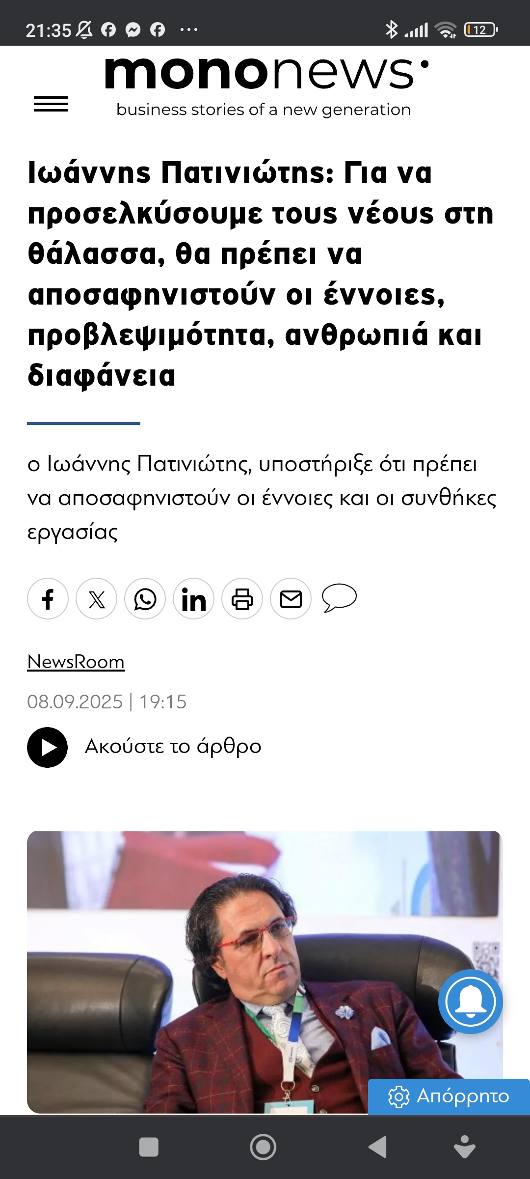 ΟικονομίαΙδιαίτερη πολιτική για τη ναυτοσύνη Πέτρος Ιωάννου7 μήνες ago7 μήνες ago01 mins 9/9/2025 Ιωάννης Πατινιώτης: Για να προσελκύσουμε τους νέους στη θάλασσα, θα πρέπει να αποσαφηνιστούν οι έννοιες, προβλεψιμότητα, ανθρωπιά και διαφάνεια Πλοήγηση άρθρων Previous: Ισραηλινό χτύπημα προς στελέχη της Χαμάς (κοντά ξιστις πρεσβείες).Next: Μια καλημέρα από τον ΚΥΡ Αφήστε μια απάντηση Ακύρωση απάντησηςΗ ηλ. διεύθυνση σας δεν δημοσιεύεται. Τα υποχρεωτικά πεδία σημειώνονται με *Σχόλιο * Όνομα * Email * Ιστότοπος Αποθήκευσε το όνομά μου, email, και τον ιστότοπο μου σε αυτόν τον πλοηγό για την επόμενη φορά που θα σχολιάσω.