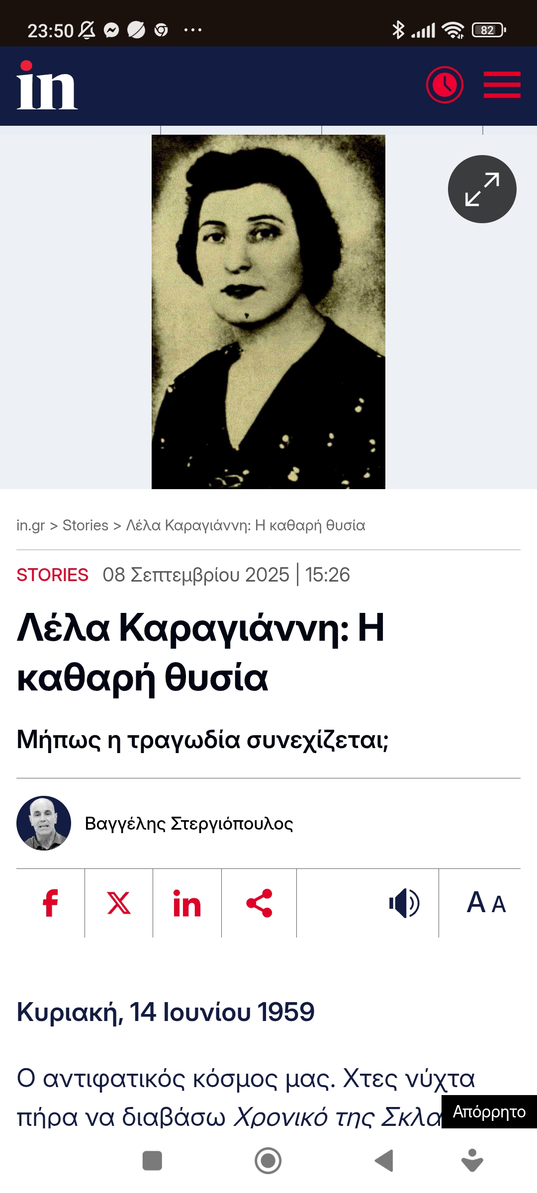 Ιστορία Όσοι ξεχωρίζουνΗ θυσία της Λέλας Καραγιάννη Πέτρος Ιωάννου7 μήνες ago7 μήνες ago01 mins Ήταν 8 Σεπτεμβρίου του 1944 Λέλα Καραγιάννη: Η καθαρή θυσία Πλοήγηση άρθρων Previous: Μια καλημέρα από τον ΚΥΡNext: 750 σχολεία λιγότερα φέτος. Χωριό, για να μην ερημώσει προσφέρει… Αφήστε μια απάντηση Ακύρωση απάντησηςΗ ηλ. διεύθυνση σας δεν δημοσιεύεται. Τα υποχρεωτικά πεδία σημειώνονται με *Σχόλιο * Όνομα * Email * Ιστότοπος Αποθήκευσε το όνομά μου, email, και τον ιστότοπο μου σε αυτόν τον πλοηγό για την επόμενη φορά που θα σχολιάσω.