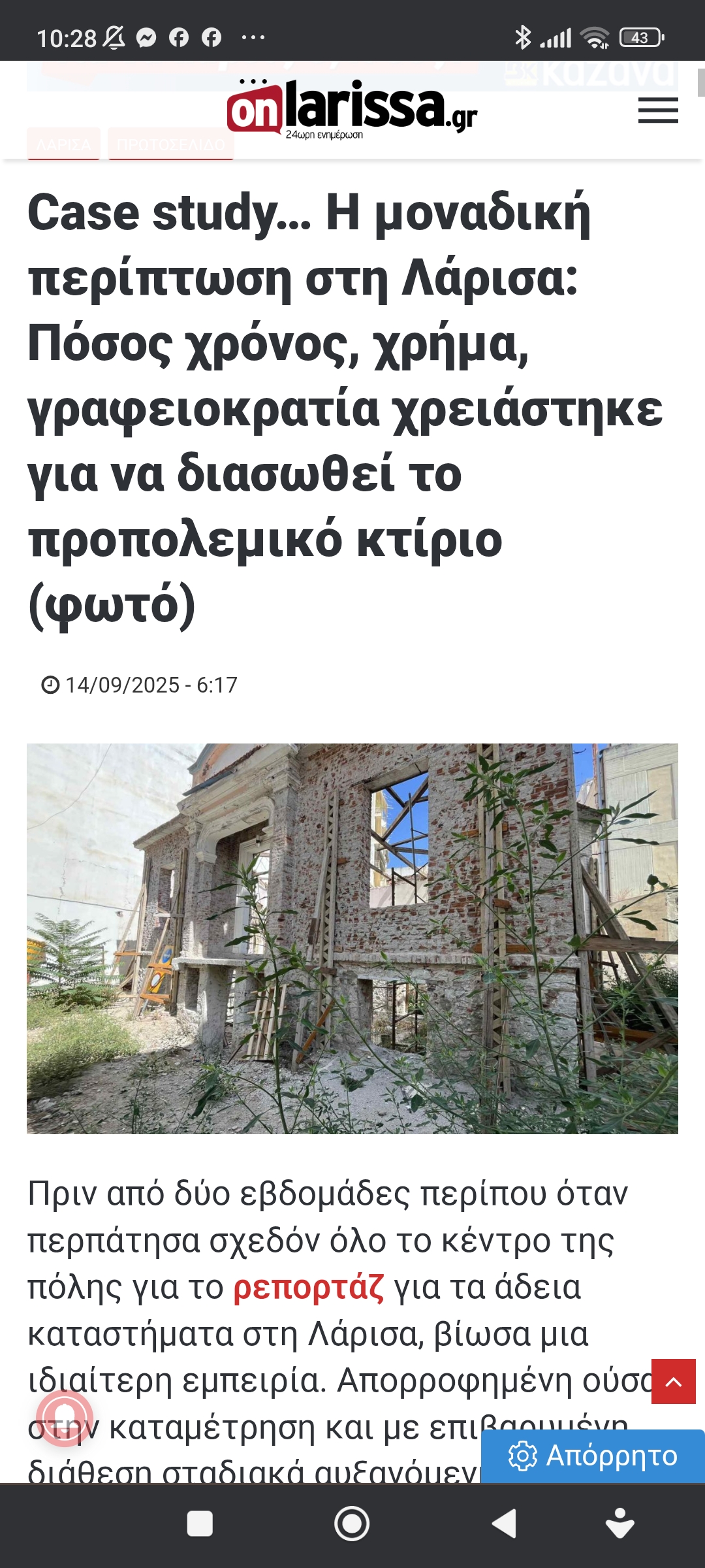 Εκπαίδευση / Πολιτισμός Θεσσαλία / ΛάρισαΑπό μύρια κύματα το διατηρητέο ακίνητο που προορίζεται για χρήση από τα παιδιά του “Κύκνος”, τα παιδιά του συνδρόμου down Πέτρος Ιωάννου7 μήνες ago7 μήνες ago01 mins 14/9/2025 https://www.onlarissa.gr/2025/09/14/case-study-i-monadiki-periptosi-sti-larisa-posos-chronos-chrima-grafeiokratia-chreiastike-gia-na-diasothei-to-propolemiko-ktirio-foto Πλοήγηση άρθρων Previous: Απ’ τις καλημέρες του ΑρκάNext: …εγκαίνια του πρώτου SANO SPOT στην αθήνα Αφήστε μια απάντηση Ακύρωση απάντησηςΗ ηλ. διεύθυνση σας δεν δημοσιεύεται. Τα υποχρεωτικά πεδία σημειώνονται με *Σχόλιο * Όνομα * Email * Ιστότοπος Αποθήκευσε το όνομά μου, email, και τον ιστότοπο μου σε αυτόν τον πλοηγό για την επόμενη φορά που θα σχολιάσω.