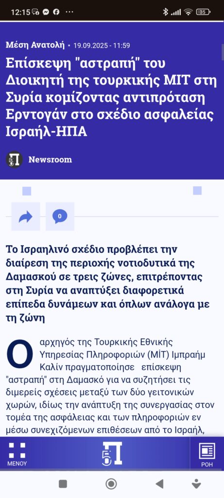 Eυρώπη / ΔιεθνήΗ Τουρκία δηλώνει παρούσα, στη Συρία Πέτρος Ιωάννου7 μήνες ago7 μήνες ago01 mins 19/9/2025 https://www.pentapostagma.gr/kosmos/mesi-anatoli/7328273_episkepsi-astrapi-toy-dioikiti-tis-toyrkikis-mit-sti-syria-komizontas#google_vignette Πλοήγηση άρθρων Previous: Αυτό ο υπουργός ίσως το πήρε από τους βλάχους: “ντουβάρι είναι και δεν γυρίζει;” Λένε…Next: …τραμπουκισμοί ισραηλινού, σε έκθεση βιβλίου Αφήστε μια απάντηση Ακύρωση απάντησηςΗ ηλ. διεύθυνση σας δεν δημοσιεύεται. Τα υποχρεωτικά πεδία σημειώνονται με *Σχόλιο * Όνομα * Email * Ιστότοπος Αποθήκευσε το όνομά μου, email, και τον ιστότοπο μου σε αυτόν τον πλοηγό για την επόμενη φορά που θα σχολιάσω.