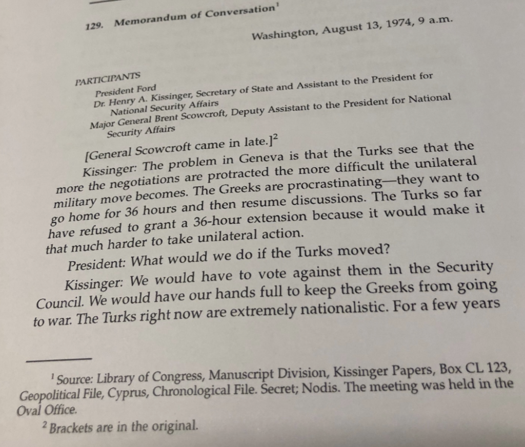 Ήταν 13 Αυγούστου 1974, συνάντηση στην Ουάσιγκτον μεταξύ του νέου Αμερικανού Προέδρου Τζέραλτ Φόρτ, Χένρι Κίσινγκερ και Major General Brent Scowcroft. Ώρα Ουάσιγκτον 9 πρωινή, ώρα Λονδίνου 2μμ και ώρα Γενεύης 3μμ.