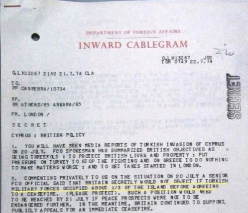 Ιδού η αναφορά από την Υπάτη Αρμοστεία της Αυστραλίας στο Λονδίνο 21.7.74 προς το αυστραλιανό υπ. Εξωτερικών: « “υψηλόβαθμος αξιωματούχος του FCO ( Φόρειν ΄Οφις) είπε ότι η Βρετανία μυστικά δεν θα είχε αντίρρηση αν τουρκικές στρατιωτικές δυνάμεις κατελάμβαναν περίπου το 1-3 του νησιού πριν συμφωνήσουν σε κατάπαυση του πυρός (παρακαλώ προστατεύστε). Η θέση αυτή θα έπρεπε να επιτευχθεί μέχρι της 21-07 για να μην τεθούν περαιτέρω εν κινδύνω οι πιθανότητες ειρήνευσης”.