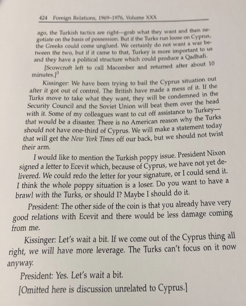 Το έγκλημα του Χένρι Κίσινγκερ, όπως φανέρωσαν τα επίσημα βρετανικά έγγραφα, είναι ότι τελικά ακολούθησε τη βρετανική φιλοτουρκική πολιτική α) λόγω της υπερβολικής αντικομμουνιστικής δικής του πολιτικής β) χρειαζόταν τις βρετανικές βάσεις στο νησί, γ) το Κυπριακό δεν ήταν θέμα των ΗΠΑ αλλά του Λονδίνου, οι ΗΠΑ ΔΕΝ ΗΣΑΝ ΕΓΓΥΗΤΡΙΑ ΔΥΝΑΜΗ για την Κυπριακή Δημοκρατία, το Ηνωμένο Βασίλειο, η Ελλάδα και Τουρκία ήταν και οι τρείς πρόδωσαν την Κύπρο και δ) το έβλεπε ως περιφερειακό θέμα με προτεραιότητα να μην εμπλακούν σε πόλεμο Ελλάδα και Τουρκία…Τέτοιο ήταν το αφήγημα εναντίον του Κίσινγκερ που δεκαετίες αργότερα χρησιμοποιήθηκαν μέχρι και χαλκευμένα τάχατες έγραφα του ΝΑΤΟ, από την Επιτροπή Μαρίνου Σιζόπουλου για να στηθεί ένα αναξιόπιστο «πόρισμα Φακέλου Κύπρου» της Βουλής των Αντιπροσώπων.
