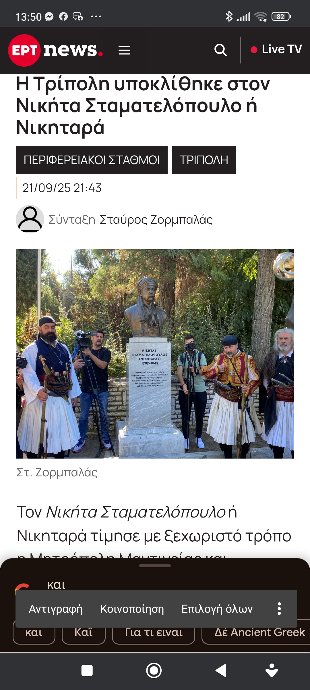 ΙστορίαΗ Τρίπολη τίμησε τον Νικηταρά με αφορμή τα 200 χρόνια, απ’ το θάνατό του Πέτρος Ιωάννου7 μήνες ago7 μήνες ago01 mins 22/9/2025 Η Τρίπολη υποκλίθηκε στον Νικήτα Σταματελόπουλο ή Νικηταρά Πλοήγηση άρθρων Previous: Οπαδοί της ΑΕΛ και της ΑΕΚ στο μεταξύ των παιχνίδι, ενωμένοι ξεμπροστιάζουν την κυβέρνηση για το φιάσκο των ΤεμπώνNext: Αngelina Jolie: Πώς ν’ αγαπήσω χώρα μου, είν’ αγνώριστη Αφήστε μια απάντηση Ακύρωση απάντησηςΗ ηλ. διεύθυνση σας δεν δημοσιεύεται. Τα υποχρεωτικά πεδία σημειώνονται με *Σχόλιο * Όνομα * Email * Ιστότοπος Αποθήκευσε το όνομά μου, email, και τον ιστότοπο μου σε αυτόν τον πλοηγό για την επόμενη φορά που θα σχολιάσω.