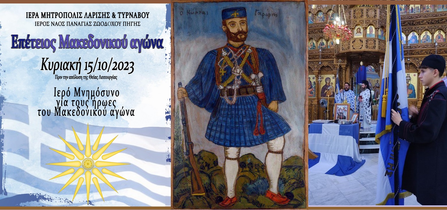 Το καθιερωμένο Ιερό Μνημόσυνο για την ανάπαυση των ψυχών των ηρώων του Μακεδονικού αγώνα, τελέσθηκε σήμερα το πρωί, Κυριακή, 15 Οκτωβρίου 2023, μετά το τέλος της Θείας Λειτουργίας, στον Ιερό Ναό Ζωοδόχου Πηγής Αμπελοκήπων. Τιμώμενο πρόσωπο ο σταυραετός του Πηλίου Κωνσταντίνος Γαρέφης. Μίλησε αισθαντικά γι’ αυτόν και για το σήμερα, ο π. Στέφανος Γιάνναρος.