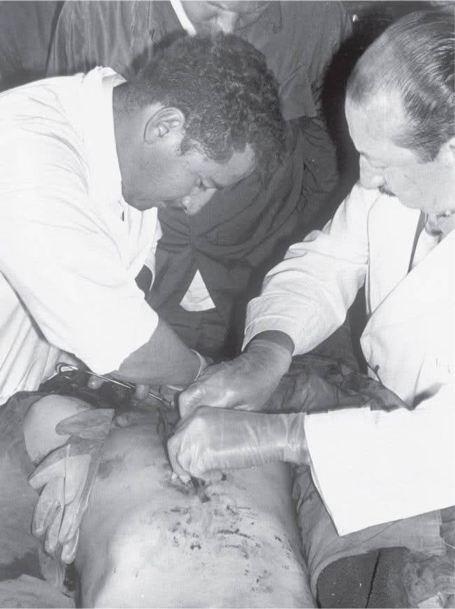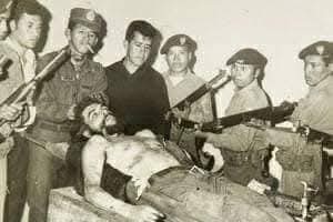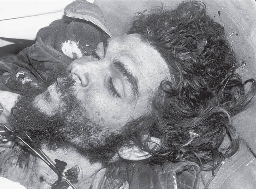 Στη φωτογραφία το σώμα του Che έχει δεθεί στο δεξί “πέδιλο προσγείωσης” του ελικοπτέρου που το περιφέρουν ως τρόπαιο.