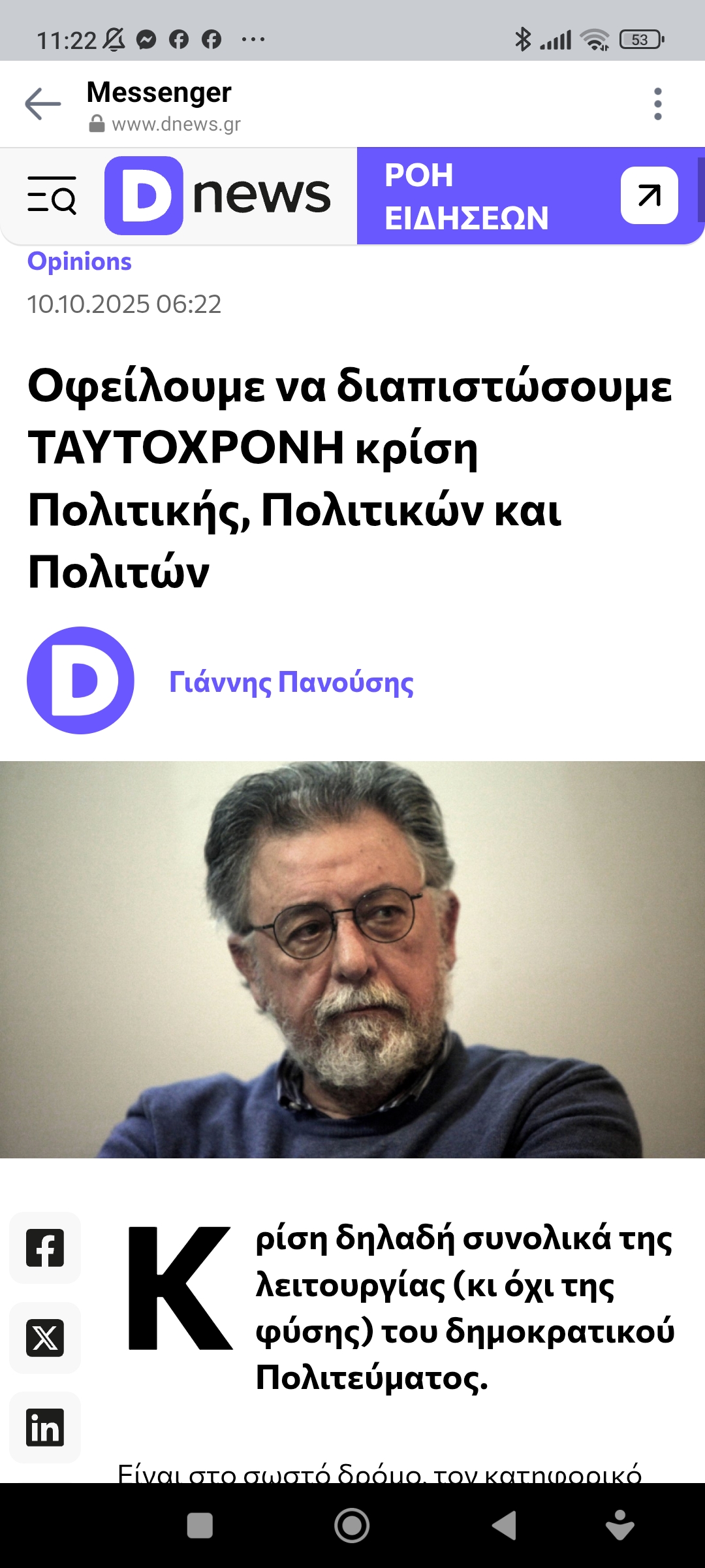 Απόψεις Κοινωνία / ΠολιτικήΟφείλουμε να διαπιστώσουμε ταυτόχρονη κρίση πολιτικής, πολιτικών, και πολιτών Πέτρος Ιωάννου6 μήνες ago6 μήνες ago01 mins 10/10/2025 γράφει: ο Γιάννης Πανούσης https://www.dnews.gr/eidhseis/opinion/550084/ofeiloume-na-diapistosoume-taftoxroni-krisi-politikis-politikon-kai-politon Πλοήγηση άρθρων Previous: “Λεβέντης εροβόλαγε…” Η μούσα η Ελληνική αποθεώνει τον άθλο του Πάνου Ρούτσι. Υποχρέωσε την ελληνική δικαιοσύνη να βάλει γυαλιάNext: Η καλημέρα του Αρκά Αφήστε μια απάντηση Ακύρωση απάντησηςΗ ηλ. διεύθυνση σας δεν δημοσιεύεται. Τα υποχρεωτικά πεδία σημειώνονται με *Σχόλιο * Όνομα * Email * Ιστότοπος Αποθήκευσε το όνομά μου, email, και τον ιστότοπο μου σε αυτόν τον πλοηγό για την επόμενη φορά που θα σχολιάσω.