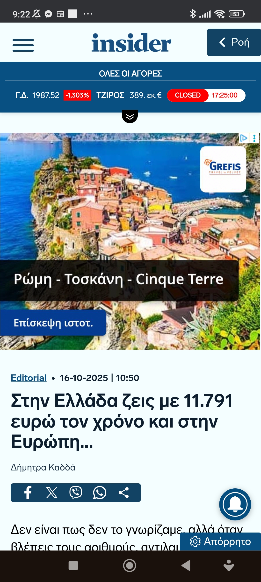 Ελλάδα / Κύπρος…στην ελλάδα ζεις με 11.791 και στην ευρώπη… Πέτρος Ιωάννου6 μήνες ago6 μήνες ago01 mins 18/10/2025 https://www.insider.gr/editorial/384026/stin-ellada-zeis-me-11791-eyro-hrono-kai-stin-eyropi Πλοήγηση άρθρων Previous: στέλεχος της Χαμάς: θέλουμε 5ετή εκεχειρία και προοπτική ίδρυσης κράτουςNext: Η καλημέρα του Αρκά Αφήστε μια απάντηση Ακύρωση απάντησηςΗ ηλ. διεύθυνση σας δεν δημοσιεύεται. Τα υποχρεωτικά πεδία σημειώνονται με *Σχόλιο * Όνομα * Email * Ιστότοπος Αποθήκευσε το όνομά μου, email, και τον ιστότοπο μου σε αυτόν τον πλοηγό για την επόμενη φορά που θα σχολιάσω.