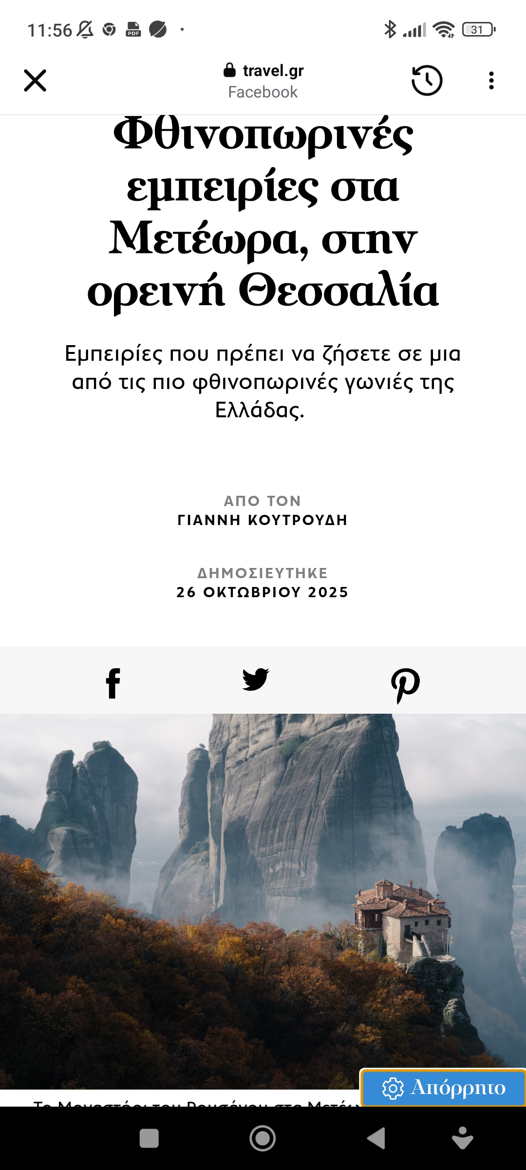Θεσσαλία / ΛάρισαΦθινοπωρινές εμπειρίες στα Μετέωρα. Ορεινή θεσσαλία Πέτρος Ιωάννου6 μήνες ago6 μήνες ago01 mins Φθινοπωρινές εμπειρίες στα Μετέωρα, στην ορεινή Θεσσαλία Πλοήγηση άρθρων Previous: Σκίτσο του Αντώνη Βαβαγιάννη για το NEWS24/7Next: Ο αδικημένος από την ιστορία Χαράλαμπος Κατσιμήτρος. Ο πατέρας της νίκης Αφήστε μια απάντηση Ακύρωση απάντησηςΗ ηλ. διεύθυνση σας δεν δημοσιεύεται. Τα υποχρεωτικά πεδία σημειώνονται με *Σχόλιο * Όνομα * Email * Ιστότοπος Αποθήκευσε το όνομά μου, email, και τον ιστότοπο μου σε αυτόν τον πλοηγό για την επόμενη φορά που θα σχολιάσω.