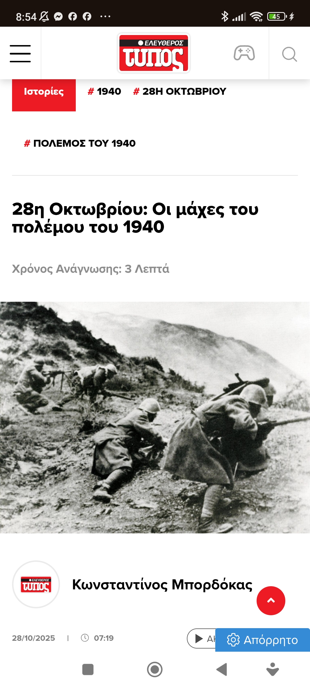 ΙστορίαΣυνοπτικά, οι μάχες του πολέμου του 1940 Πέτρος Ιωάννου6 μήνες ago6 μήνες ago01 mins 28/10/2025 https://eleftherostypos.gr/istories/28i-oktovriou-oi-maches-tou-polemou-tou-1940 Πλοήγηση άρθρων Previous: Η καλημέρα του ΑρκάNext: Άν ευημερούσαν οι άνθρωποι και όχι οι αριθμοί δεν θάχαμε καθεστώς… Αφήστε μια απάντηση Ακύρωση απάντησηςΗ ηλ. διεύθυνση σας δεν δημοσιεύεται. Τα υποχρεωτικά πεδία σημειώνονται με *Σχόλιο * Όνομα * Email * Ιστότοπος Αποθήκευσε το όνομά μου, email, και τον ιστότοπο μου σε αυτόν τον πλοηγό για την επόμενη φορά που θα σχολιάσω.