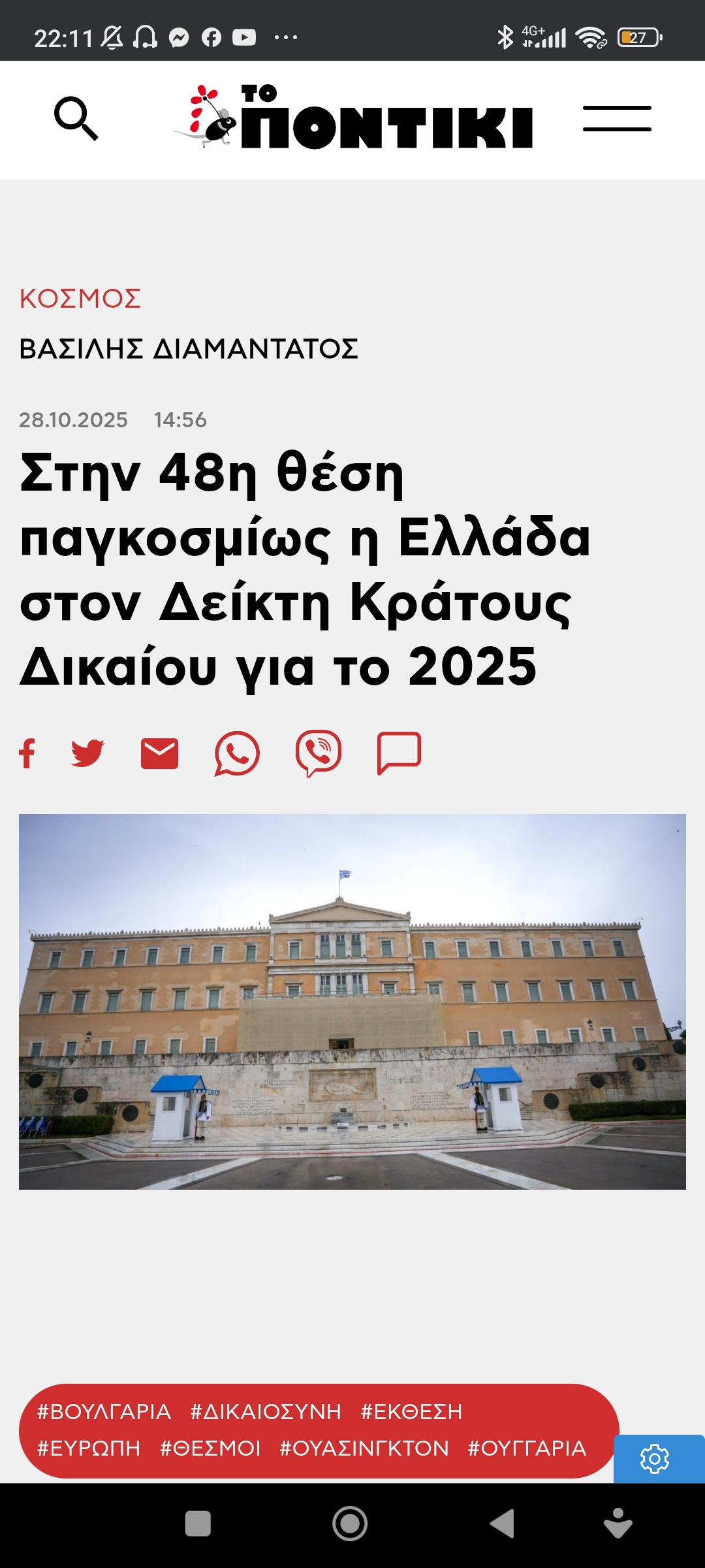 Έγκλημα και τιμωρίαΗ δικαιοσύνη με τον αραμπά στην Ελλάδα Πέτρος Ιωάννου6 μήνες ago6 μήνες ago01 mins 28/10/2025 Στην 48η θέση παγκοσμίως η Ελλάδα στον Δείκτη Κράτους Δικαίου για το 2025 Πλοήγηση άρθρων Previous: Ανδρέας Ρουμελιώτης: Η ασπόνδυλη αριστερά μας καθηλώνει αλλά τα νιάτα μας ανυψώνουν το ηθικόNext: για πόσα ακόμη χρόνια ο πήχης θάναι χαμηλά; Αφήστε μια απάντηση Ακύρωση απάντησηςΗ ηλ. διεύθυνση σας δεν δημοσιεύεται. Τα υποχρεωτικά πεδία σημειώνονται με *Σχόλιο * Όνομα * Email * Ιστότοπος Αποθήκευσε το όνομά μου, email, και τον ιστότοπο μου σε αυτόν τον πλοηγό για την επόμενη φορά που θα σχολιάσω.