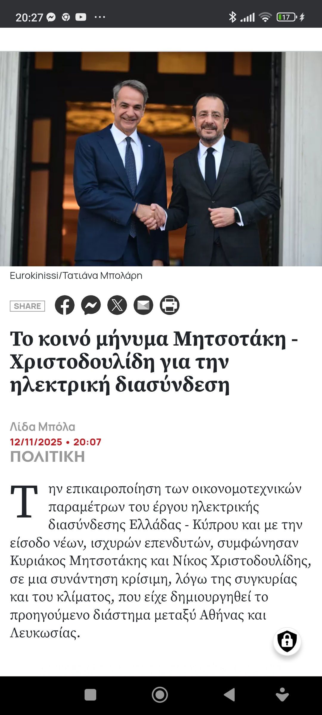 Ελλάδα / Κύπροςκοινό μήνυμα Μητσοτάκη – Χριστο δουλίδη για την ηλεκτρική διασύνδεση Πέτρος Ιωάννου5 μήνες ago5 μήνες ago01 mins https://www.liberal.gr/politiki/koino-minyma-mitsotaki-hristodoylidi-gia-tin-ilektriki-diasyndesi Πλοήγηση άρθρων Previous: Σκίτσο του Ηλία Μακρή για την ΚαθημερινήNext: Ιπποκράτειος βοτανικός κήπος στο Αλκαζάρ Αφήστε μια απάντηση Ακύρωση απάντησηςΗ ηλ. διεύθυνση σας δεν δημοσιεύεται. Τα υποχρεωτικά πεδία σημειώνονται με *Σχόλιο * Όνομα * Email * Ιστότοπος Αποθήκευσε το όνομά μου, email, και τον ιστότοπο μου σε αυτόν τον πλοηγό για την επόμενη φορά που θα σχολιάσω.