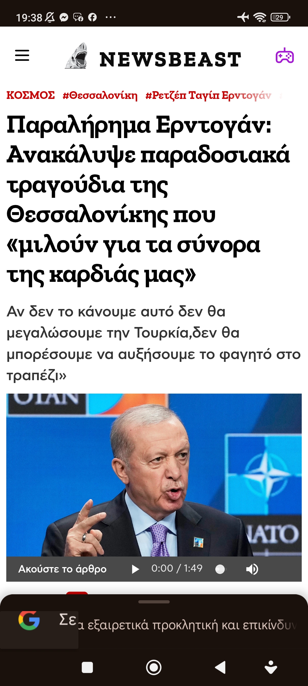 Eυρώπη / ΔιεθνήΕρντογάν:Τραγούδια από Υεμένη, μέχρι Θεσσαλονίκη δείχνουν τα σύνορα της καρδιάς μας Πέτρος Ιωάννου5 μήνες ago5 μήνες ago01 mins 19/11/2025 https://www.newsbeast.gr/world/arthro/12710052/paralirima-erntogan-anakalypse-paradosiaka-tragoudia-tis-thessalonikis-pou-miloun-gia-ta-synora-tis-kardias-mas Πλοήγηση άρθρων Previous: Νεοκλής Σαρρής, εις μνήμηνNext: Το 77% των Ελληνοκυπρίων ενοχοποιεί και την Ελλάδα για την εισβολή, το δε 67% πιστεύει πως μπορούσε να βοηθήσει στο 2ο Αττίλα Αφήστε μια απάντηση Ακύρωση απάντησηςΗ ηλ. διεύθυνση σας δεν δημοσιεύεται. Τα υποχρεωτικά πεδία σημειώνονται με *Σχόλιο * Όνομα * Email * Ιστότοπος Αποθήκευσε το όνομά μου, email, και τον ιστότοπο μου σε αυτόν τον πλοηγό για την επόμενη φορά που θα σχολιάσω.