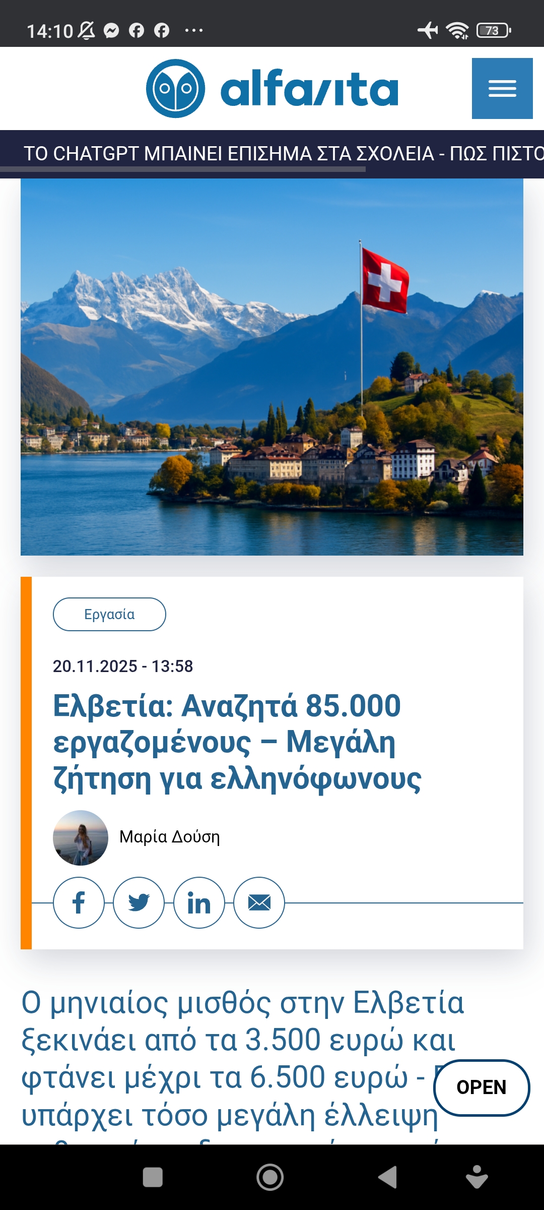 Eυρώπη / Διεθνή ΟικονομίαΕυκαιρίες εργασιακές στην Ελβετία Πέτρος Ιωάννου5 μήνες ago5 μήνες ago01 mins https://www.alfavita.gr/ergasia/497254_elbetia-anazita-85000-ergazomenoys-megali-zitisi-gia-ellinofonoys#goog_rewarded Πλοήγηση άρθρων Previous: Όταν φεύγουν οι τουρίστεςNext: Κλειστή στο Λούβρο, η γκαλερί Campana με τα αρχαία ελληνικά αγγεία λόγω σοβαρής φθοράς δοκών Αφήστε μια απάντηση Ακύρωση απάντησηςΗ ηλ. διεύθυνση σας δεν δημοσιεύεται. Τα υποχρεωτικά πεδία σημειώνονται με *Σχόλιο * Όνομα * Email * Ιστότοπος Αποθήκευσε το όνομά μου, email, και τον ιστότοπο μου σε αυτόν τον πλοηγό για την επόμενη φορά που θα σχολιάσω.