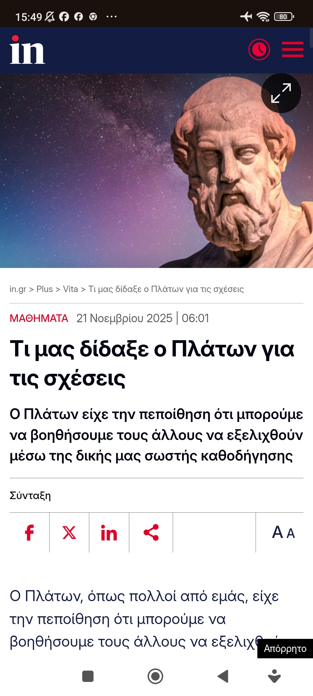 Σχέσεις - ΥγείαΗ θέση του Πλάτωνα για τις σχέσεις Πέτρος Ιωάννου5 μήνες ago5 μήνες ago01 mins 22/11/2025 Τι μας δίδαξε ο Πλάτων για τις σχέσεις Πλοήγηση άρθρων Previous: Μια καλημέρα απ’ τον ΚΥΡNext: Η γνώμη των τουριστών για την Ελλάδα Αφήστε μια απάντηση Ακύρωση απάντησηςΗ ηλ. διεύθυνση σας δεν δημοσιεύεται. Τα υποχρεωτικά πεδία σημειώνονται με *Σχόλιο * Όνομα * Email * Ιστότοπος Αποθήκευσε το όνομά μου, email, και τον ιστότοπο μου σε αυτόν τον πλοηγό για την επόμενη φορά που θα σχολιάσω.