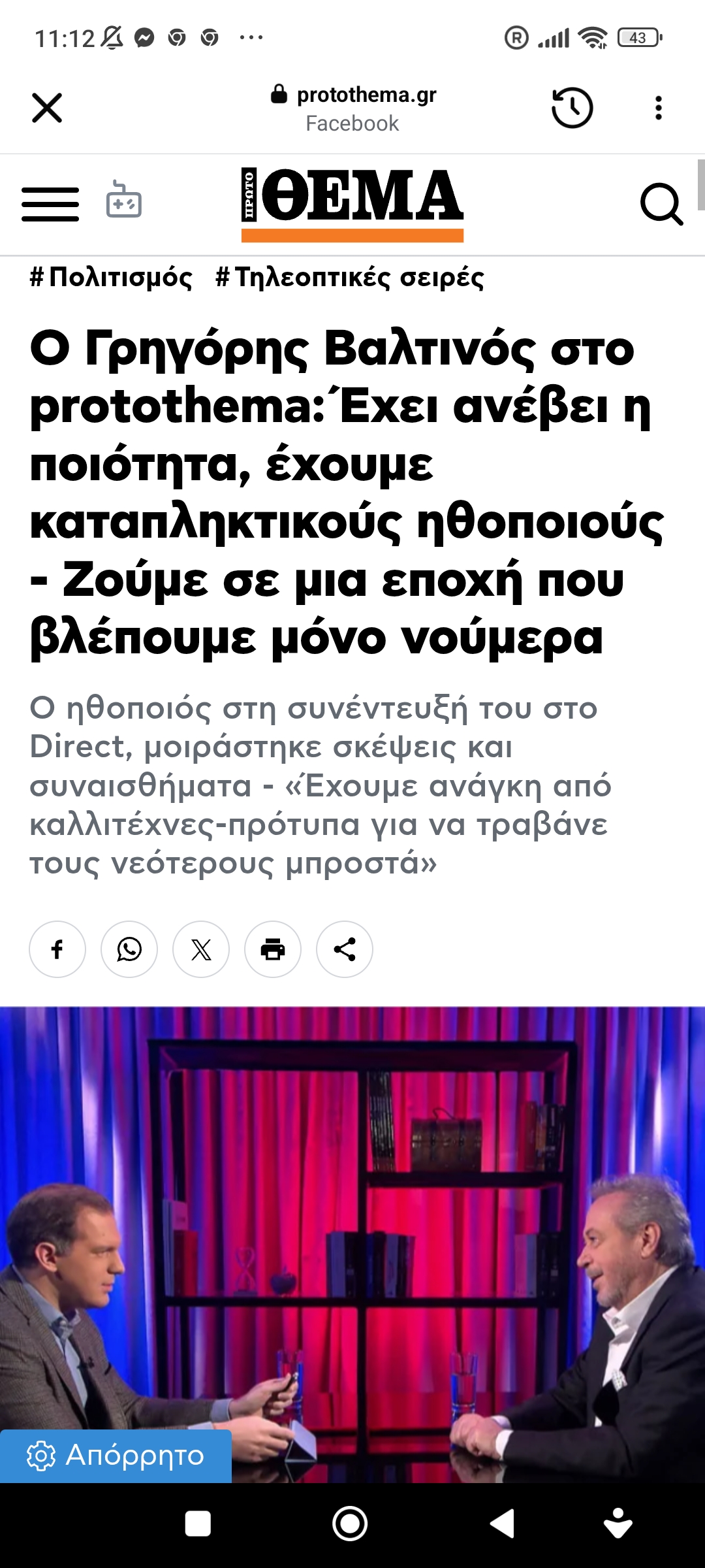 Εκπαίδευση / ΠολιτισμόςΓρηγόρης Βαλτινός: Η κρίση, η δίψα είναι ολοφάνερη γι’αυτό και τρέχουν στην πηγή, στο θέατρο Πέτρος Ιωάννου5 μήνες ago5 μήνες ago01 mins 24/11/2025 https://www.protothema.gr/greece/article/1731642/o-grigoris-valtinos-sto-protothema-zoume-se-mia-epohi-pou-ehei-stegnosei-to-pneuma-vlepoume-padou-mono-noumera/?fbclid=IwVERDUAOQ8rVleHRuA2FlbQIxMABzcnRjBmFwcF9pZAwzNTA2ODU1MzE3MjgAAR4YcOUpZlJLa5XV0fQp_cDkbDurdrMACFUA-iUUlmzWth8qofWo32Cd_4M-Pg_aem_sQ9U0tM8WJvl4-DKoyqVSQ Πλοήγηση άρθρων Previous: Ένα απ’ τα μεγαλύτερα λάθη: Δεν είναι πολύ κουτό νάχεις εξουσία και να τη δίνεις…Next: 2,5 χρόνια χωρίς εκλογές… Με ή χωρίς εκλογές η κατάσταση είναι ανώμαλη… Άρα; Αφήστε μια απάντηση Ακύρωση απάντησηςΗ ηλ. διεύθυνση σας δεν δημοσιεύεται. Τα υποχρεωτικά πεδία σημειώνονται με *Σχόλιο * Όνομα * Email * Ιστότοπος Αποθήκευσε το όνομά μου, email, και τον ιστότοπο μου σε αυτόν τον πλοηγό για την επόμενη φορά που θα σχολιάσω.
