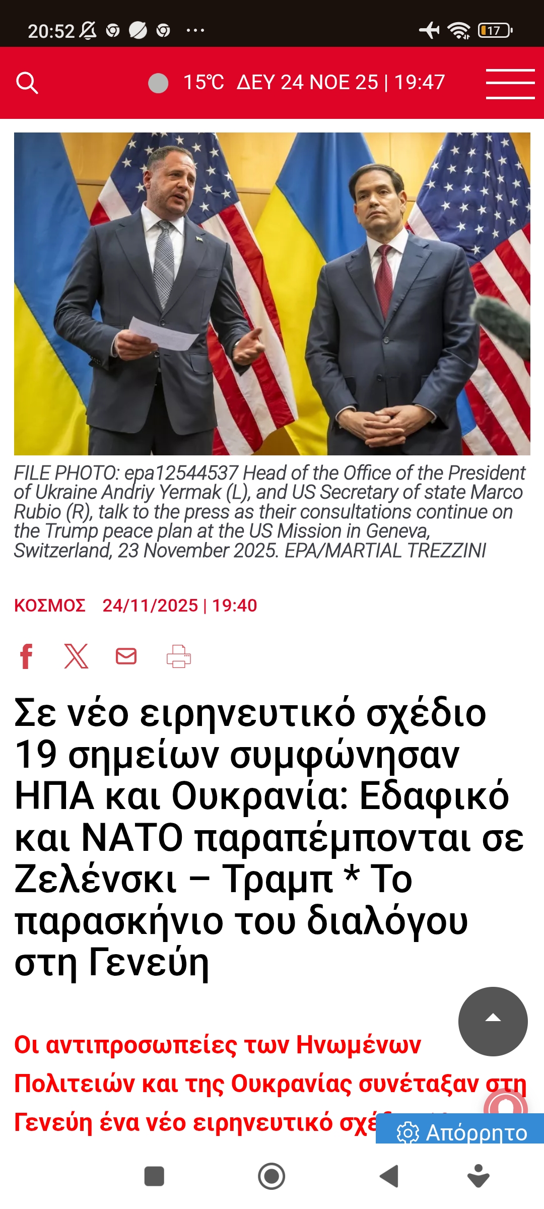 Eυρώπη / ΔιεθνήΚάπως προχωρά το ειρηνευτικό σχέδιο… Πέτρος Ιωάννου5 μήνες ago5 μήνες ago01 mins 24/11/2025 Σε νέο ειρηνευτικό σχέδιο 19 σημείων συμφώνησαν ΗΠΑ και Ουκρανία: Εδαφικό και ΝΑΤΟ παραπέμπονται σε Ζελένσκι – Τραμπ * Το παρασκήνιο του διαλόγου στη Γενεύη Πλοήγηση άρθρων Previous: Χρόνης Μίσσιος. Εις μνήμηνNext: “Σώστε τις γυναίκες” Ένας δεκάλογος για τη γυναίκα Αφήστε μια απάντηση Ακύρωση απάντησηςΗ ηλ. διεύθυνση σας δεν δημοσιεύεται. Τα υποχρεωτικά πεδία σημειώνονται με *Σχόλιο * Όνομα * Email * Ιστότοπος Αποθήκευσε το όνομά μου, email, και τον ιστότοπο μου σε αυτόν τον πλοηγό για την επόμενη φορά που θα σχολιάσω.