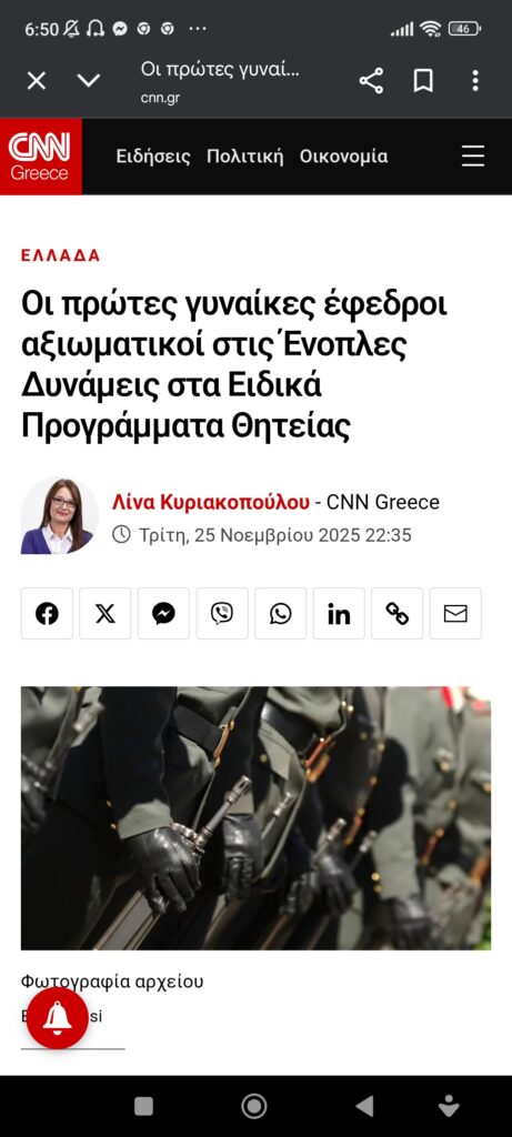Άμυνα / ΣτρατηγικήΟι πρώτες γυναίκες έφεδροι αξιωματικοί στο στράτευμα είναι γεγονός Πέτρος Ιωάννου5 μήνες ago5 μήνες ago01 mins https://www.cnn.gr/ellada/story/507064/oi-protes-gynaikes-efedroi-aksiomatikoi-stis-enoples-dynameis-sta-eidika-programmata-thiteias Πλοήγηση άρθρων Previous: η καλημέρα του ΑρκάNext: Ιστορικές συμφωνίες Κύπρου – Λιβάνου. Κύπρου – Ελλάδας θα δούμε; Αφήστε μια απάντηση Ακύρωση απάντησηςΗ ηλ. διεύθυνση σας δεν δημοσιεύεται. Τα υποχρεωτικά πεδία σημειώνονται με *Σχόλιο * Όνομα * Email * Ιστότοπος Αποθήκευσε το όνομά μου, email, και τον ιστότοπο μου σε αυτόν τον πλοηγό για την επόμενη φορά που θα σχολιάσω.