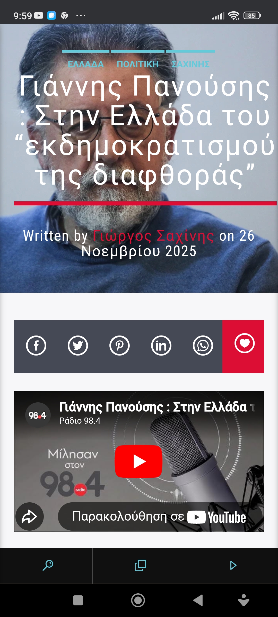 Γιάννης Πανούσης: “Σύγχρονα Αριστερά αλλά όχι εκσυγχρονισμένα Αριστερά” Πέτρος Ιωάννου6 ώρες ago6 ώρες ago 0