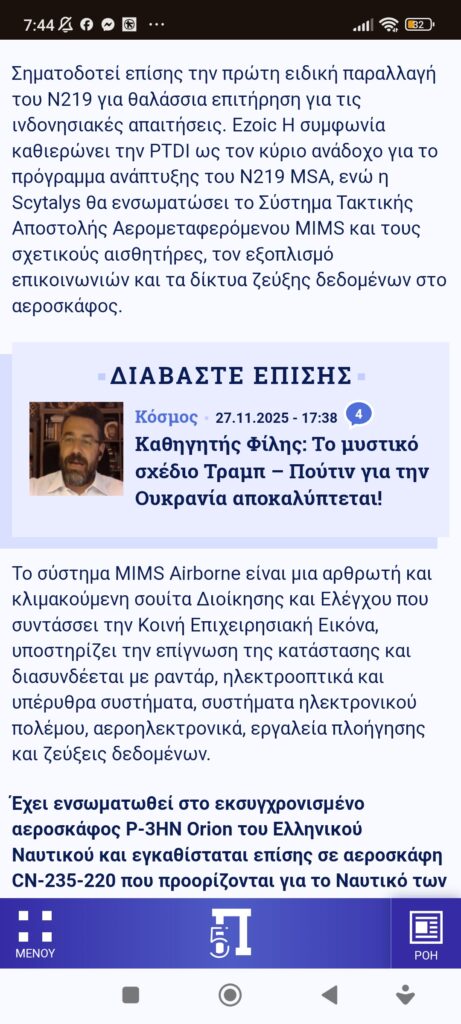 Eυρώπη / Διεθνή Άμυνα / ΣτρατηγικήΣυνεργασία Ινδονησίας με την ελληνική scytalys για το νέο αεροσκάφος θαλάσσιας περιπολίας N219 MSA Πέτρος Ιωάννου5 μήνες ago5 μήνες ago01 mins Η Ελλάδα μπορεί μέσω συνεργασιών να κατασκευάσει τρομερά οπλικά συστήματα 28/11/2025 Πηγή: ΠΕΝΤΑΠΟΣΤΑΓΜΑ Πλοήγηση άρθρων Previous: Ποιοί είναι οι αποδέκτες;Next: Το μυστικό σχέδιο Τράμπ – Πούτιν αποκαλύπτεται Αφήστε μια απάντηση Ακύρωση απάντησηςΗ ηλ. διεύθυνση σας δεν δημοσιεύεται. Τα υποχρεωτικά πεδία σημειώνονται με *Σχόλιο * Όνομα * Email * Ιστότοπος Αποθήκευσε το όνομά μου, email, και τον ιστότοπο μου σε αυτόν τον πλοηγό για την επόμενη φορά που θα σχολιάσω.