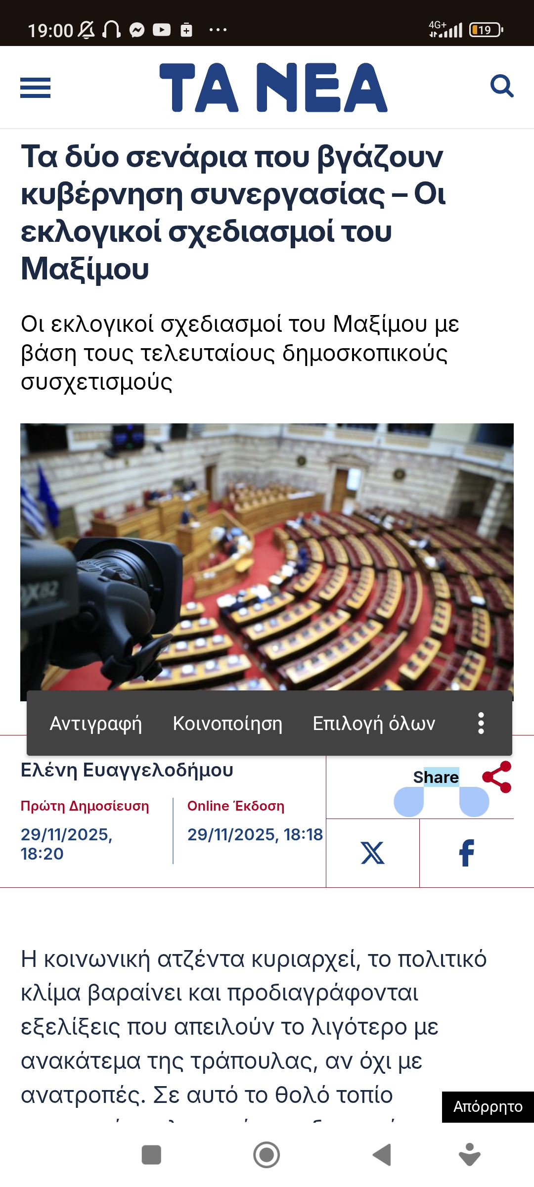 Κοινωνία / ΠολιτικήΟταν οι εφημερίδες “ζυγίζουν” τα σενάρια της επόμενης των εκλογών, μέρας Πέτρος Ιωάννου5 μήνες ago5 μήνες ago01 mins 29/11/2025 Τα δύο σενάρια που βγάζουν κυβέρνηση συνεργασίας – Οι εκλογικοί σχεδιασμοί του Μαξίμου Πλοήγηση άρθρων Previous: Μπέρναρντ Σω: Πόση εξυπνάδα καταναλώνουμε για να διορθώσουμε τις κουταμάρες μας…Next: …από μικρό κι από τρελό μαθαίνεις την αλήθεια Αφήστε μια απάντηση Ακύρωση απάντησηςΗ ηλ. διεύθυνση σας δεν δημοσιεύεται. Τα υποχρεωτικά πεδία σημειώνονται με *Σχόλιο * Όνομα * Email * Ιστότοπος Αποθήκευσε το όνομά μου, email, και τον ιστότοπο μου σε αυτόν τον πλοηγό για την επόμενη φορά που θα σχολιάσω.