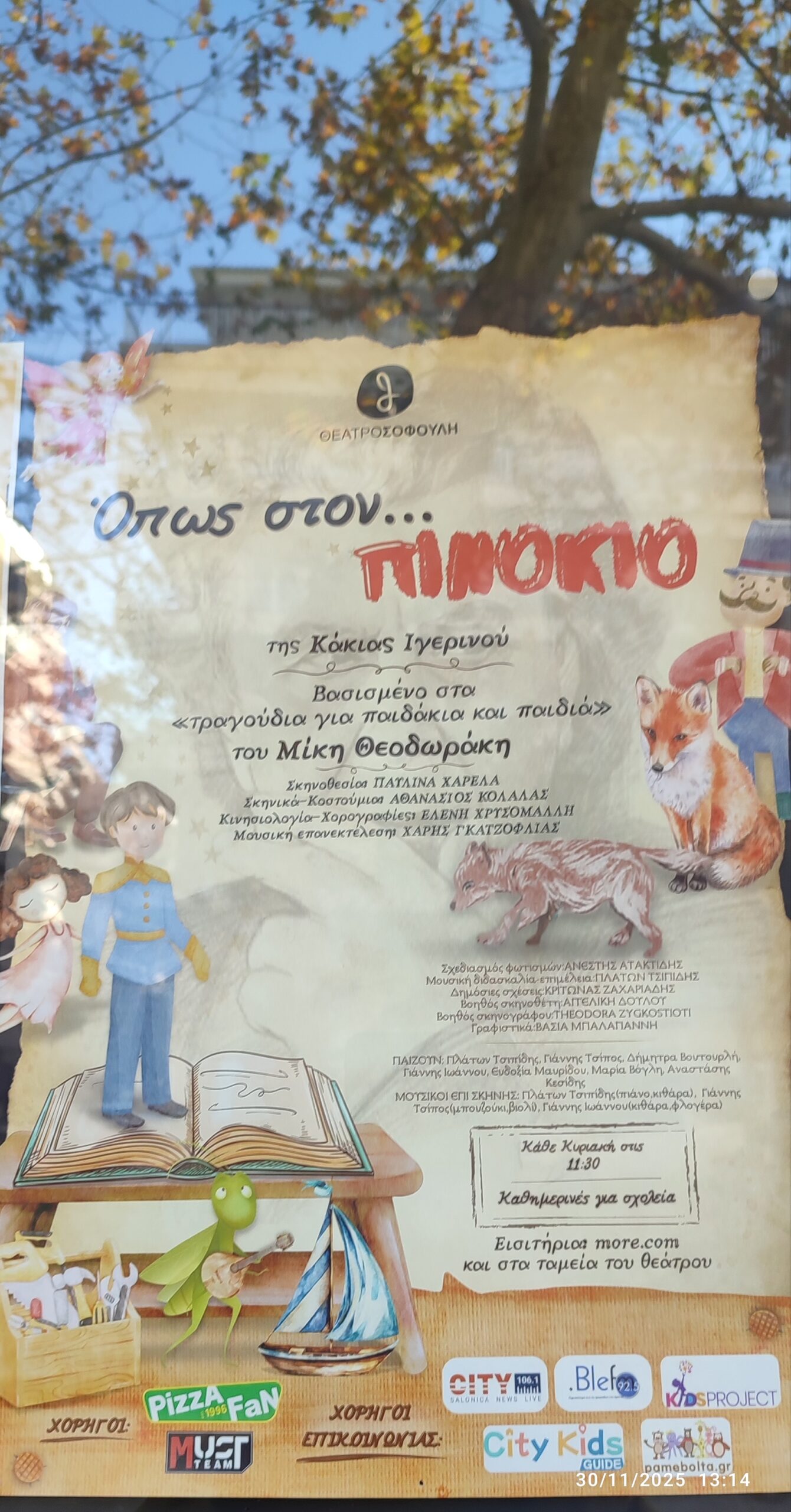 ” Όπως στον…Πινόκιο” της Κάτιας Ιγερινού. Βασισμένο σε τραγούδια του Μίκη Θεοδωράκη για παιδιά. Σκηνοθεσία Παυλίνα Χαρέλα. Στο θέατρο Σοφούλη στην Καλαμαριά