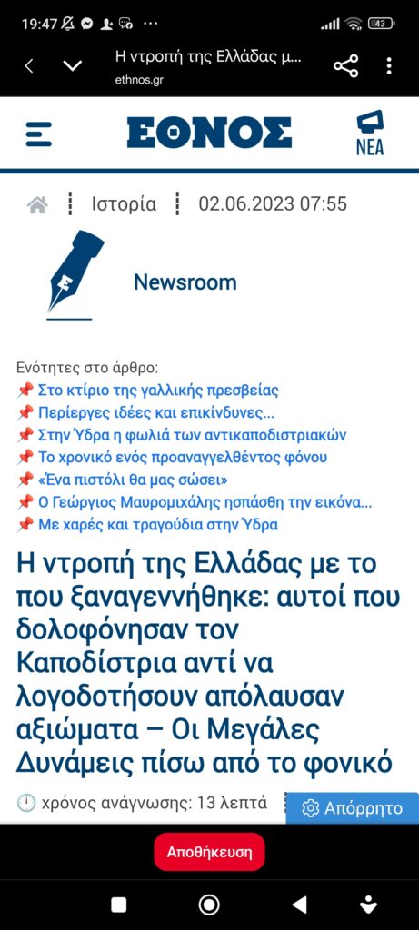 ΙστορίαΤο φονικό του Καποδίστρια Οι εκτελεστές, οι μεγάλες δυνάμεις Πέτρος Ιωάννου4 μήνες ago4 μήνες ago01 mins https://pin.it/73k3mDV41 Πλοήγηση άρθρων Previous: “ΚΑΘΕ ΤΡΙΤΗ ΜΕ ΤΟΝ ΜΟΡΙ” Με τους Γρηγόρη Βαλτινό και Γιάννη Σαρακατσάνη στο θέατρο Βολονάκη (Ιλίσια). Μια παράσταση αριστούργημα που είχα την τύχη να τη δω το ’19 και φέτοςNext: Σκίτσο του Γιώργου Μικάλεφ για το ThePressProject Αφήστε μια απάντηση Ακύρωση απάντησηςΗ ηλ. διεύθυνση σας δεν δημοσιεύεται. Τα υποχρεωτικά πεδία σημειώνονται με *Σχόλιο * Όνομα * Email * Ιστότοπος Αποθήκευσε το όνομά μου, email, και τον ιστότοπο μου σε αυτόν τον πλοηγό για την επόμενη φορά που θα σχολιάσω.