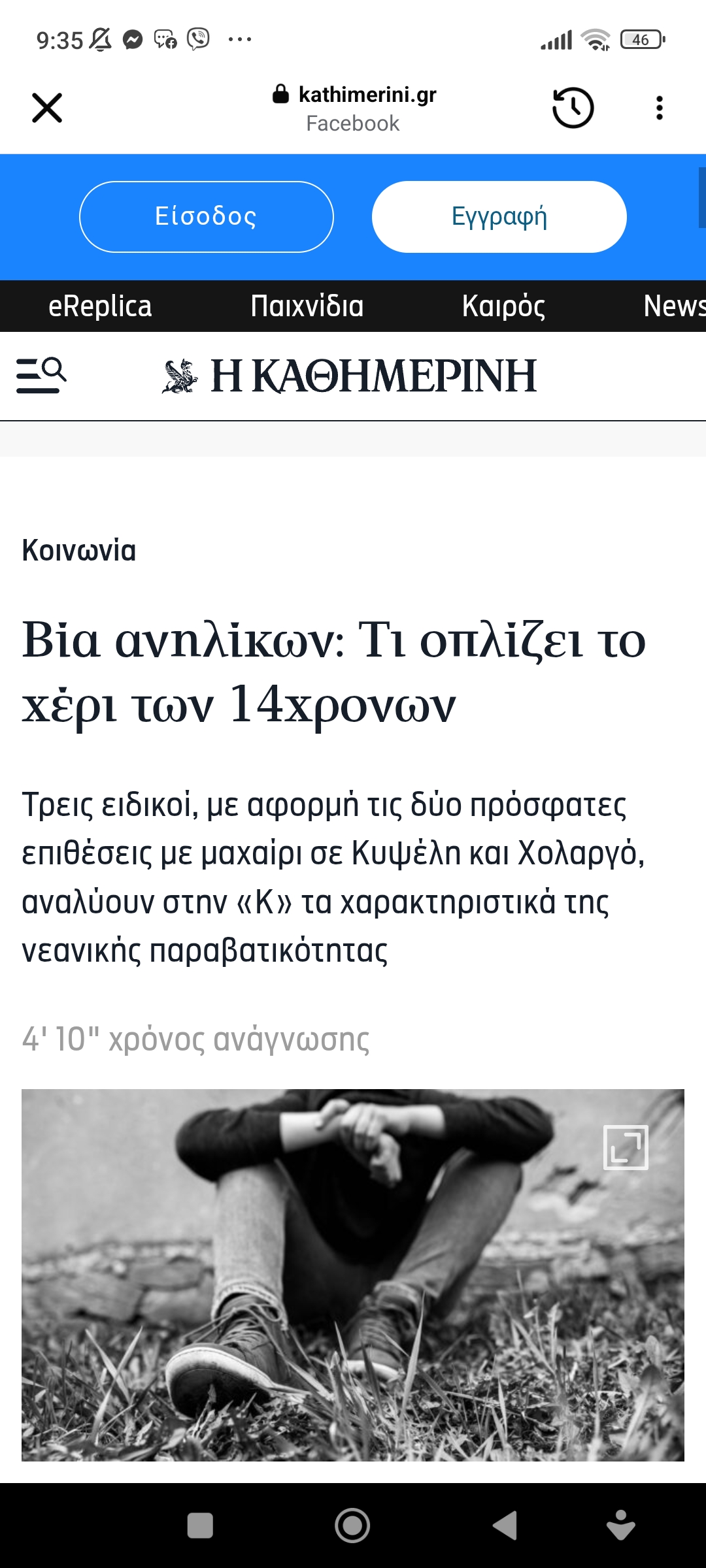 Απόψεις Έγκλημα και τιμωρίαΒία ανηλίκων. Τι οπλίζει το χέρι των 14χρονων Πέτρος Ιωάννου4 μήνες ago4 μήνες ago01 mins 15/12/2025 Του Γιάννη Πανούση https://www.kathimerini.gr/society/563977102/via-anilikon-ti-oplizei-to-cheri-ton-14xronon/?fbclid=IwdGRjcAOt6v1jbGNrA63qqHNydGMGYXBwX2lkDDM1MDY4NTUzMTcyOAABHheLLjFwQhBpz0gOR4sShMLc_wIdbwB7USvaUWIyNHWgXIOOCByk_3XFLdBy&brid=GkTsToG9UZ40ICJuBmILvQ Πλοήγηση άρθρων Previous: ΤΡΙΛΟΓΙΑ ΕΘΝΙΚΗΣ ΧΡΕΟΚΟΠΙΑΣNext: Σχεδόν έτοιμη για όλα η Μ. Καρυστιανού Αφήστε μια απάντηση Ακύρωση απάντησηςΗ ηλ. διεύθυνση σας δεν δημοσιεύεται. Τα υποχρεωτικά πεδία σημειώνονται με *Σχόλιο * Όνομα * Email * Ιστότοπος Αποθήκευσε το όνομά μου, email, και τον ιστότοπο μου σε αυτόν τον πλοηγό για την επόμενη φορά που θα σχολιάσω.