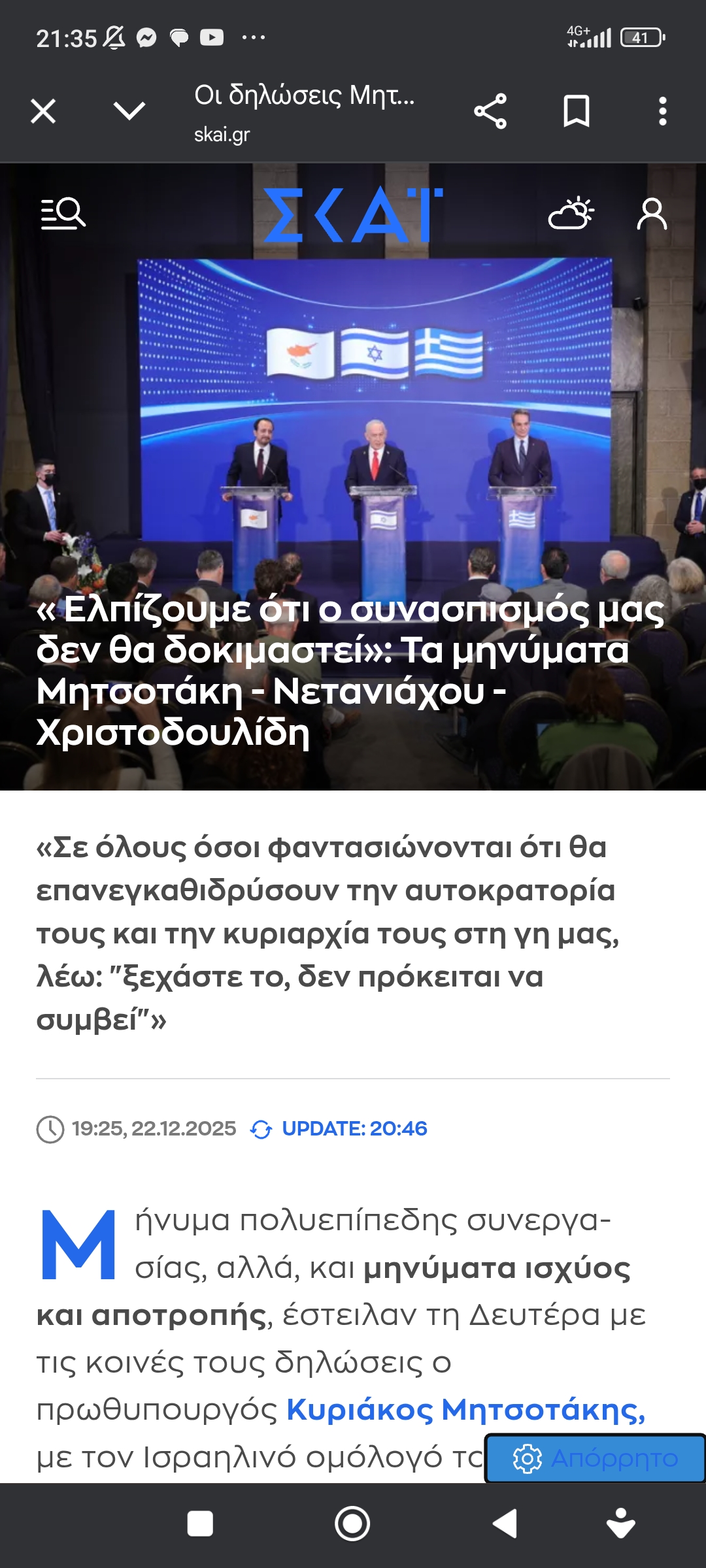 Eυρώπη / Διεθνή Ελλάδα / Κύπρος…ελπίζουμε ότι ο συνασπισμός μας δεν θα δοκιμαστεί Πέτρος Ιωάννου4 μήνες ago4 μήνες ago01 mins https://www.skai.gr/news/politics/oi-diloseis-mitsotaki-netaniaxou-pylonas-eythynis-i-symmaxia-israil-elladas-kai-kyprou Πλοήγηση άρθρων Previous: Ο “Καποδίστριας” και γιατί στην Ελλάδα και στην Κύπρο είναι επικίνδυνο να είσαι ΈλληναςNext: Φταίει ο Ν.Παππάς ή εκείνοι που τον κάναν ευρωβουλευτή… Αφήστε μια απάντηση Ακύρωση απάντησηςΗ ηλ. διεύθυνση σας δεν δημοσιεύεται. Τα υποχρεωτικά πεδία σημειώνονται με *Σχόλιο * Όνομα * Email * Ιστότοπος Αποθήκευσε το όνομά μου, email, και τον ιστότοπο μου σε αυτόν τον πλοηγό για την επόμενη φορά που θα σχολιάσω.