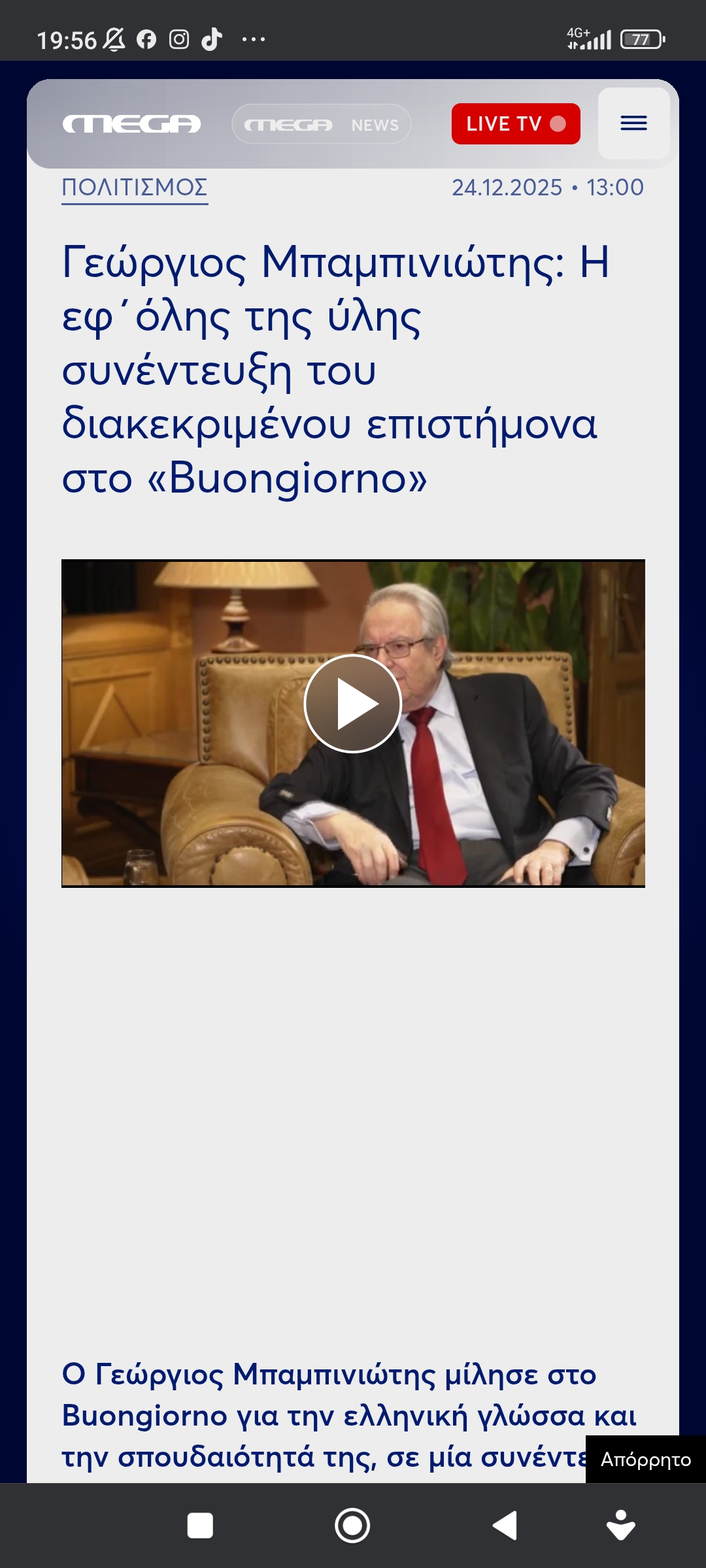 Βίντεο Εκπαίδευση / ΠολιτισμόςΜπαμπινιώτης: Προστίθενται και τα Ελληνικά στις 7 παγκόσμιες γλώσσες Πέτρος Ιωάννου4 μήνες ago4 μήνες ago01 mins https://www.megatv.com/2025/12/24/georgios-mpampiniotis-i-ef%CE%84olis-tis-ylis-synenteyksi-tou-diakekrimenou-epistimona-sto-buongiorno Πλοήγηση άρθρων Previous: Ο “Καποδίστριας” αδικεί τον ΚαποδίστριαNext: Το απόρθητο Κρεμλίνο, κατόπιν ενεργειών του Μπέρια Αφήστε μια απάντηση Ακύρωση απάντησηςΗ ηλ. διεύθυνση σας δεν δημοσιεύεται. Τα υποχρεωτικά πεδία σημειώνονται με *Σχόλιο * Όνομα * Email * Ιστότοπος Αποθήκευσε το όνομά μου, email, και τον ιστότοπο μου σε αυτόν τον πλοηγό για την επόμενη φορά που θα σχολιάσω.