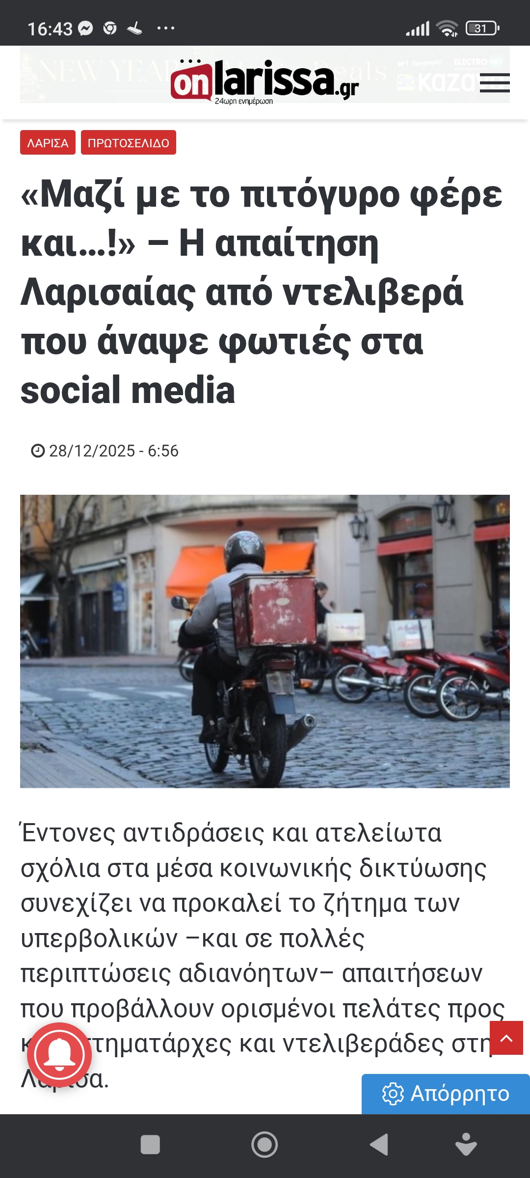 Θεσσαλία / ΛάρισαΦέρε πιτόγυρο και… Πέτρος Ιωάννου4 μήνες ago4 μήνες ago01 mins https://www.onlarissa.gr/2025/12/28/mazi-me-to-pitogyro-fere-kai-i-apaitisi-larisaias-apo-ntelivera-pou-anapse-foties-sta-social-media/?utm_source=projectagora&utm_medium=contentdiscovery Πλοήγηση άρθρων Previous: Οριστική δικαίωση των εκπαιδευτηρίων Μαίρης ΡάπτουNext: Στα μπλόκα Νίκαιας, η Καρυστιανού. Προφανώς και υπάρχει λόγος Αφήστε μια απάντηση Ακύρωση απάντησηςΗ ηλ. διεύθυνση σας δεν δημοσιεύεται. Τα υποχρεωτικά πεδία σημειώνονται με *Σχόλιο * Όνομα * Email * Ιστότοπος Αποθήκευσε το όνομά μου, email, και τον ιστότοπο μου σε αυτόν τον πλοηγό για την επόμενη φορά που θα σχολιάσω.