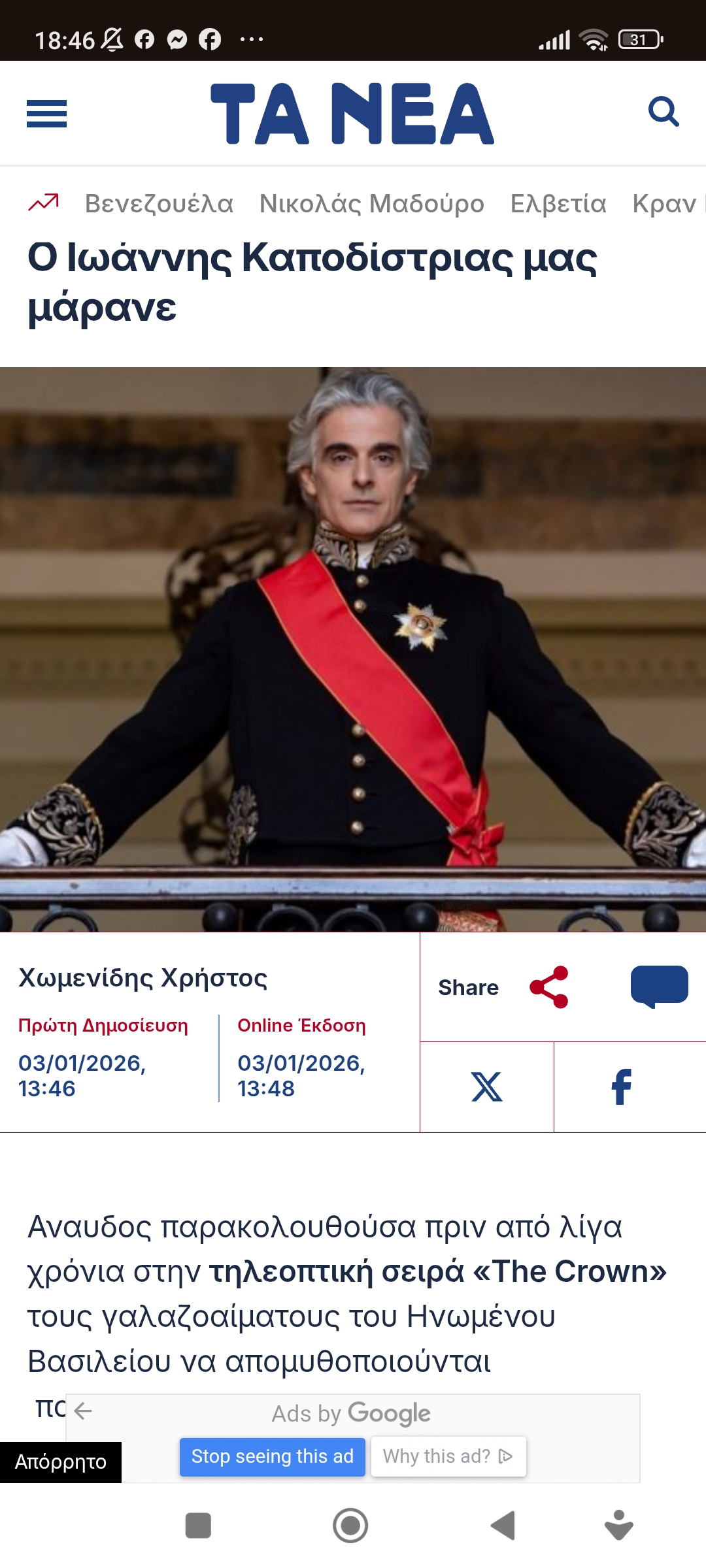 Απόψεις Εκπαίδευση / ΠολιτισμόςΧωμενίδης: Ο Καποδίστριας μας μάρανε Πέτρος Ιωάννου3 μήνες ago3 μήνες ago01 mins Ο Ιωάννης Καποδίστριας μας μάρανε Πλοήγηση άρθρων Previous: Σοκ απ’ την ωμή εισβολή των ΗΠΑ στη ΒενεζουέλαNext: Σμαραγδής: Η Ελλάδα δεν είναι αυτοδύναμη δημοκρατία αλλά το άθροισμα εγκληματικών ενεργειών των πολιτικών Αφήστε μια απάντηση Ακύρωση απάντησηςΗ ηλ. διεύθυνση σας δεν δημοσιεύεται. Τα υποχρεωτικά πεδία σημειώνονται με *Σχόλιο * Όνομα * Email * Ιστότοπος Αποθήκευσε το όνομά μου, email, και τον ιστότοπο μου σε αυτόν τον πλοηγό για την επόμενη φορά που θα σχολιάσω.