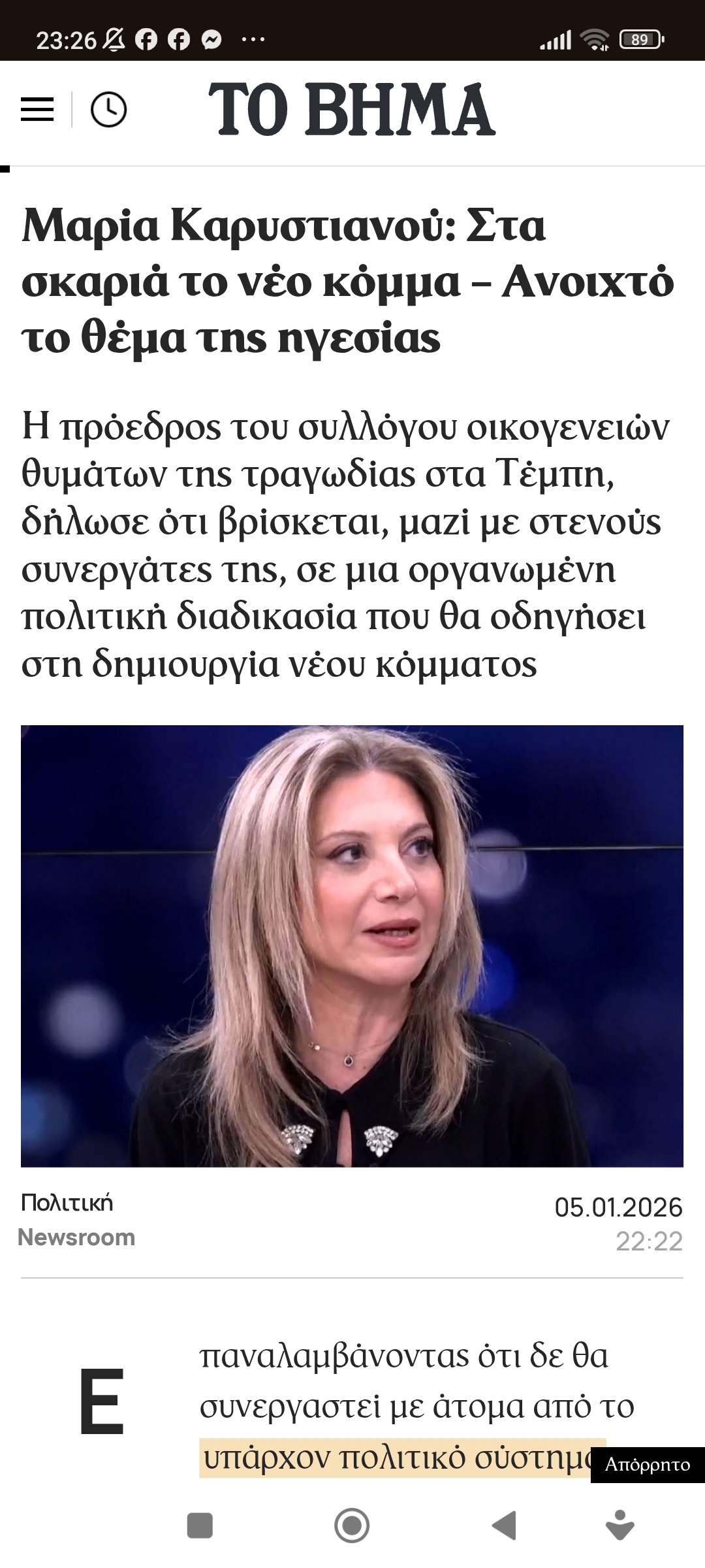 Έγκλημα και τιμωρία Κοινωνία / ΠολιτικήΟ κύβος ερρίφθη Πέτρος Ιωάννου3 μήνες ago3 μήνες ago01 mins 5/1/2025 Μαρία Καρυστιανού: Στα σκαριά το νέο κόμμα – Ανοιχτό το θέμα της ηγεσίας Πλοήγηση άρθρων Previous: Μεγάλοι ΈλληνεςNext: Εφ’ όλης της ύλης, η Μαρία Καρυστιανού στο Κontra Αφήστε μια απάντηση Ακύρωση απάντησηςΗ ηλ. διεύθυνση σας δεν δημοσιεύεται. Τα υποχρεωτικά πεδία σημειώνονται με *Σχόλιο * Όνομα * Email * Ιστότοπος Αποθήκευσε το όνομά μου, email, και τον ιστότοπο μου σε αυτόν τον πλοηγό για την επόμενη φορά που θα σχολιάσω.
