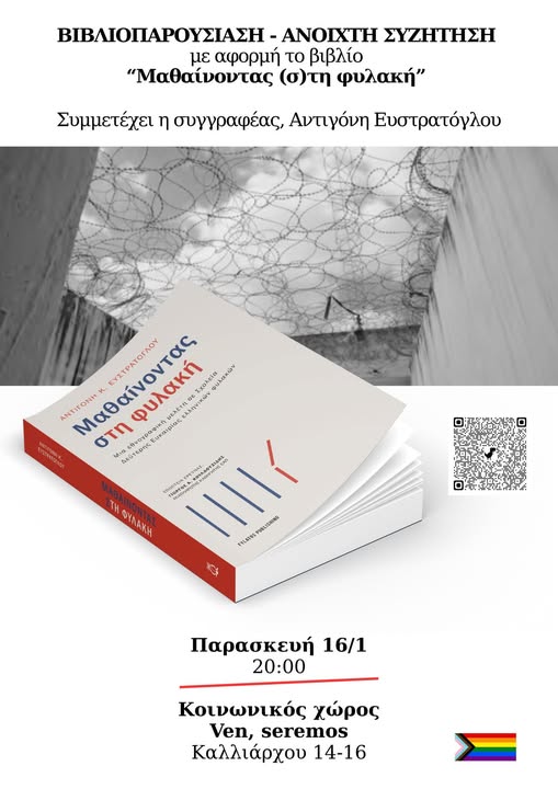 Την Παρασκευή στις 20.00 θα συζητήσουμε με τη συγγραφέα, μεταδιδακτορική ερευνήτρια του Ελληνικού Ανοικτού Πανεπιστημίου και εκπαιδευτικό σε σχολεία φυλακών από το 2017, Αντιγόνη Ευστρατόγλου, γύρω από επείγοντα ερωτήματα που θέτει ο αθέατος κόσμος των φυλακών