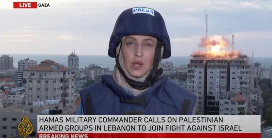 Η ανταποκρίτρια του Al Jazeera Nida Ibrahim μεταδίδει τις δραματικές εξελίξεις στη Μέση Ανατολή και στη διάρκεια της ζωντανής μετάδοσης οι Ισραηλινοί βομβαρδίζουν τα κτίρια του Πύργου της Παλαιστίνης στη Γάζα.