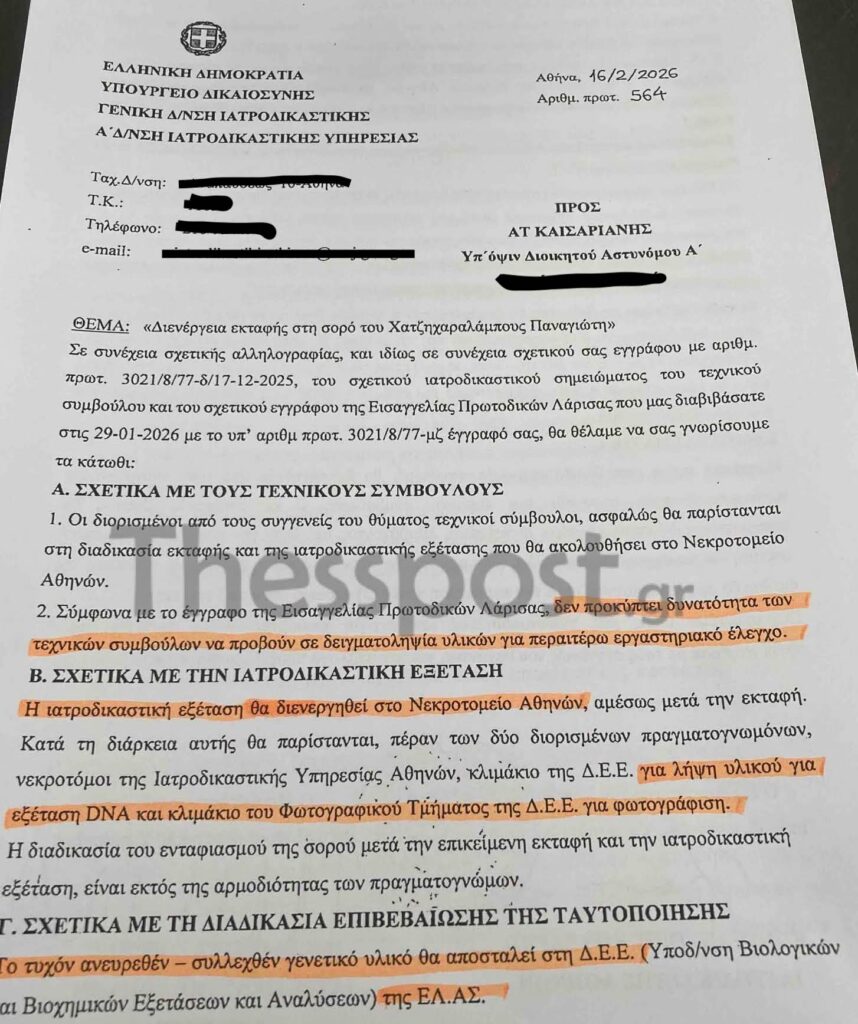 Στο έγγραφο που αποκαλύπτει το ThessPost.gr για τη διενέργεια εκταφής της σορού του Παναγιώτη Χατζηχαραλάμπους, ενός από τα εννέα θύματα για τα οποία έχει κατατεθεί αίτημα εκταφής, αναφέρει στην ουσία ότι ότι οι τεχνικοί σύμβουλοι θα μπορούν να παραστούν στη διαδικασία σε ρόλο… θεατή, μη μπορώντας να προβούν σε δειγματοληψία για περαιτέρω εργαστηριακό έλεγχο.
