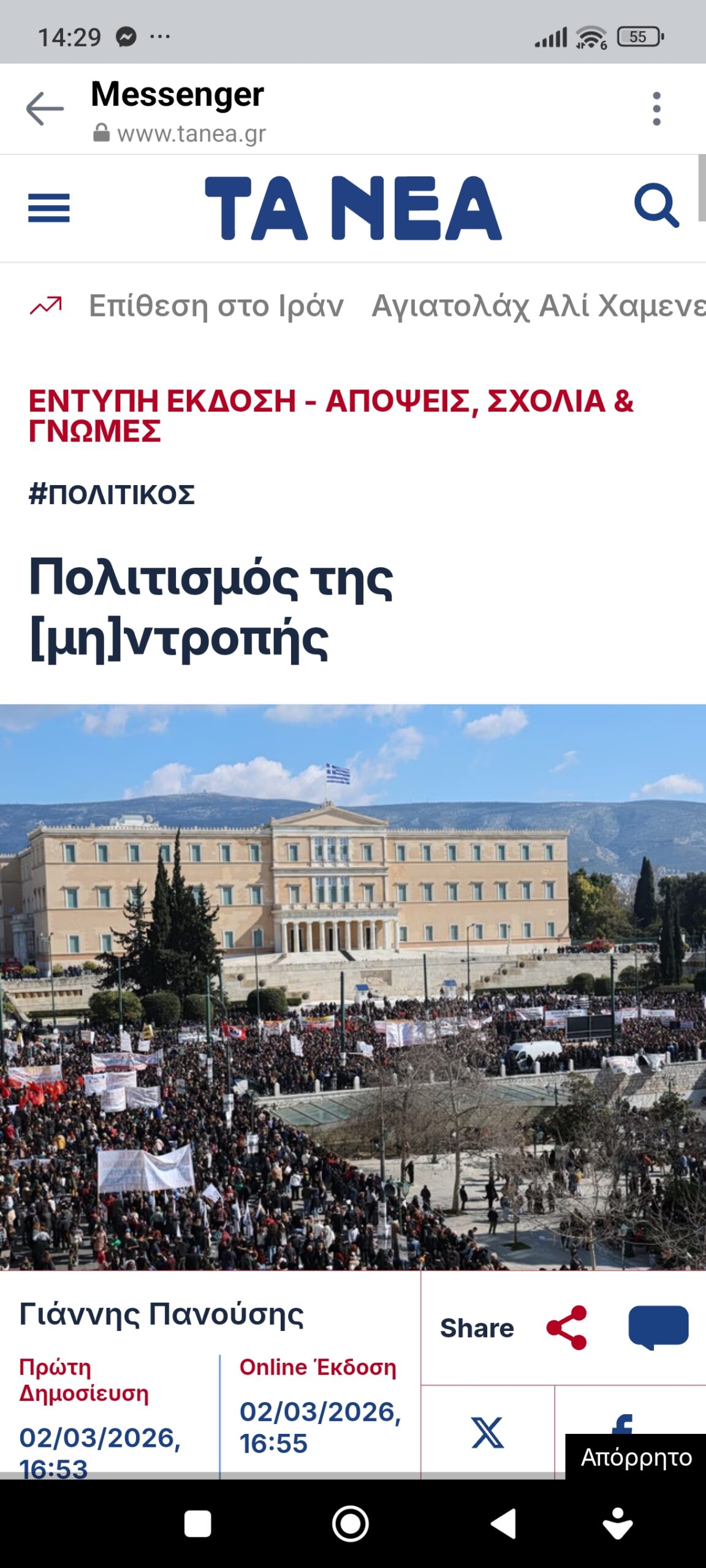 ΑπόψειςΠολιτισμός της [μη] ντροπής Πέτρος Ιωάννου1 μήνα ago1 μήνα ago01 mins 2/3/2026 του Γιάννη Πανούση Πολιτισμός της [μη]ντροπής Πλοήγηση άρθρων Previous: Σκίτσο της Έφης Ξένου για τα ΝΕΑNext: Σκίτσο του Κώστα Μητρόπουλου για τα ΝΕΑ Αφήστε μια απάντηση Ακύρωση απάντησηςΗ ηλ. διεύθυνση σας δεν δημοσιεύεται. Τα υποχρεωτικά πεδία σημειώνονται με *Σχόλιο * Όνομα * Email * Ιστότοπος Αποθήκευσε το όνομά μου, email, και τον ιστότοπο μου σε αυτόν τον πλοηγό για την επόμενη φορά που θα σχολιάσω.