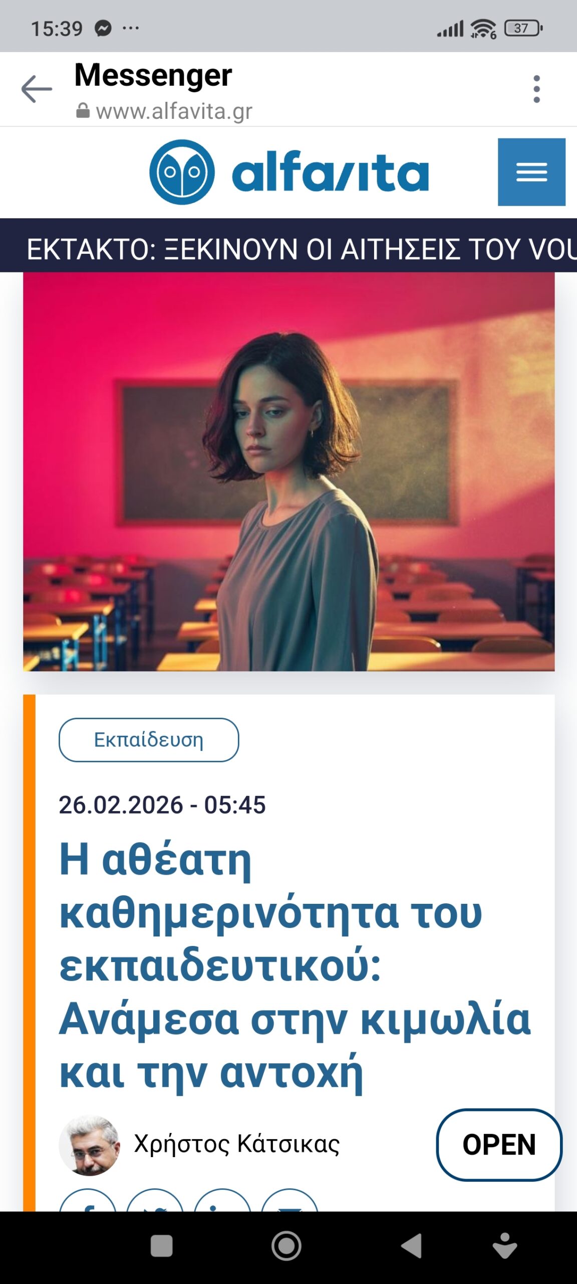 Απόψεις Εκπαίδευση / ΠολιτισμόςΗ αθέατη καθημερινότητα του εκπαιδευτικού: Ανάμεσα στην κιμωλία και την αντοχή Πέτρος Ιωάννου1 μήνα ago1 μήνα ago01 mins του Χρήστου Κάτσικα 26/2/2026 https://www.alfavita.gr/ekpaideysi/507802_i-atheati-kathimerinotita-toy-ekpaideytikoy-anamesa-stin-kimolia-kai-tin-antohi?fbclid=IwY2xjawQWZqRleHRuA2FlbQIxMQBzcnRjBmFwcF9pZAwzNTA2ODU1MzE3MjgAAR5Fkd5aLjVboWLtfRSsaX-fXZSOnYh8yTbu3r5xJbzUOnE6lxibu79lEyHOrQ_aem_-Q6JCtjvWEH-EMiadUtZbw Πλοήγηση άρθρων Previous: Ιωάννα Κωνσταντινίδου: «Όταν είπα ότι είχα κακοποιηθεί, μου είπαν “μη μιλήσεις”»Next: Αφού κοντεύετε να λευτερώσετε το Ιράν δε λευτερώνετε και την Κύπρο; Αφήστε μια απάντηση Ακύρωση απάντησηςΗ ηλ. διεύθυνση σας δεν δημοσιεύεται. Τα υποχρεωτικά πεδία σημειώνονται με *Σχόλιο * Όνομα * Email * Ιστότοπος Αποθήκευσε το όνομά μου, email, και τον ιστότοπο μου σε αυτόν τον πλοηγό για την επόμενη φορά που θα σχολιάσω.